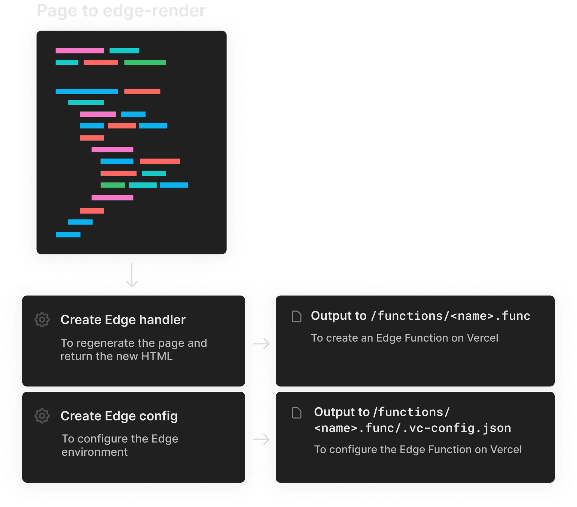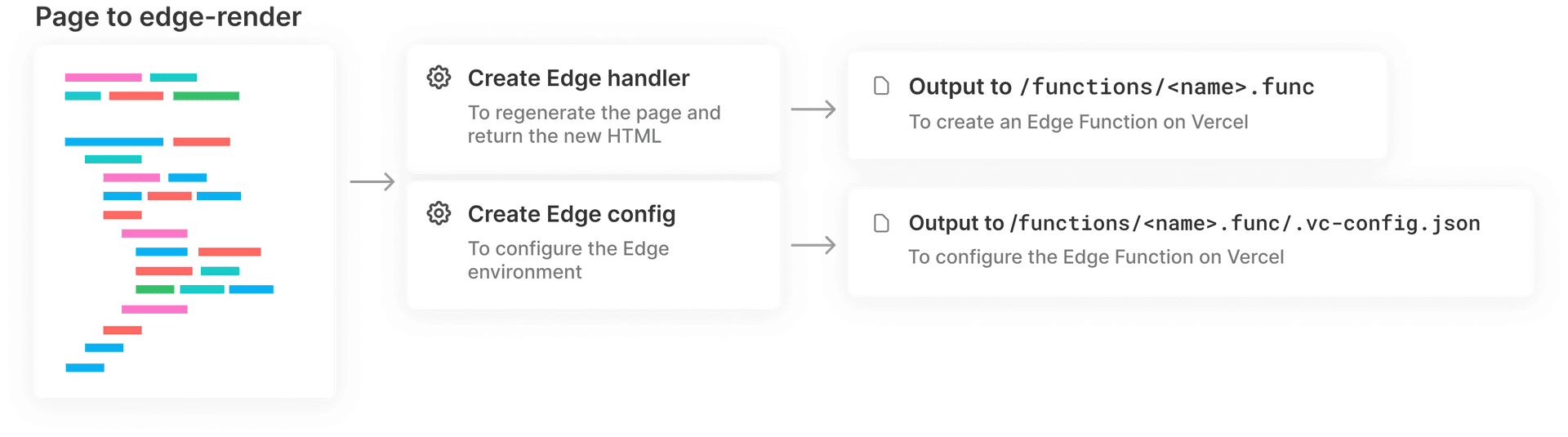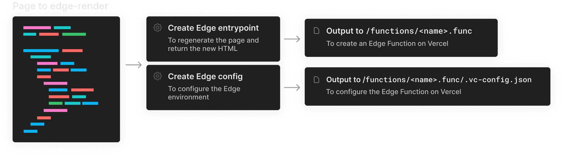 Let’s create a createEdgeFunction function that takes care of generating the necessary files to enable Edge Server-Rendering. This function calls the generateEdgeBundle function that eventually takes care of bundling the required files, and creates a .vc-config.json configuration file that indicates we’re using the edge runtime with an entrypoint file instead of a handler.