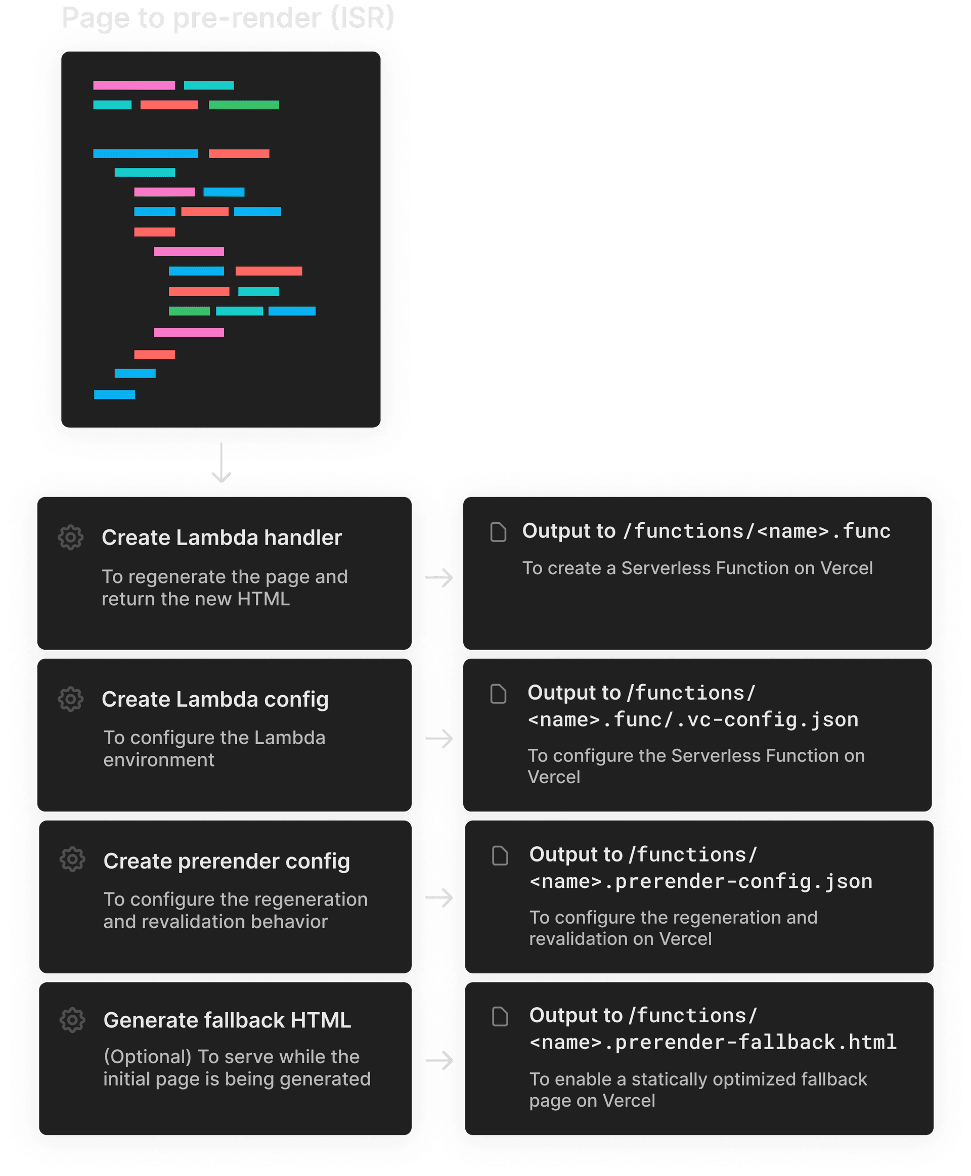 Now that we have the necessary methods to support the rendering patterns and optimize images, we can traverse the pages directory and invoke the functions to create the required files. We’re also copying all the static files - such as images, CSS, and JavaScript - from the project’s public folder to the .vercel/output/static folder and creating a .vercel/output/config.json file based on the project’s vercel.config.js.