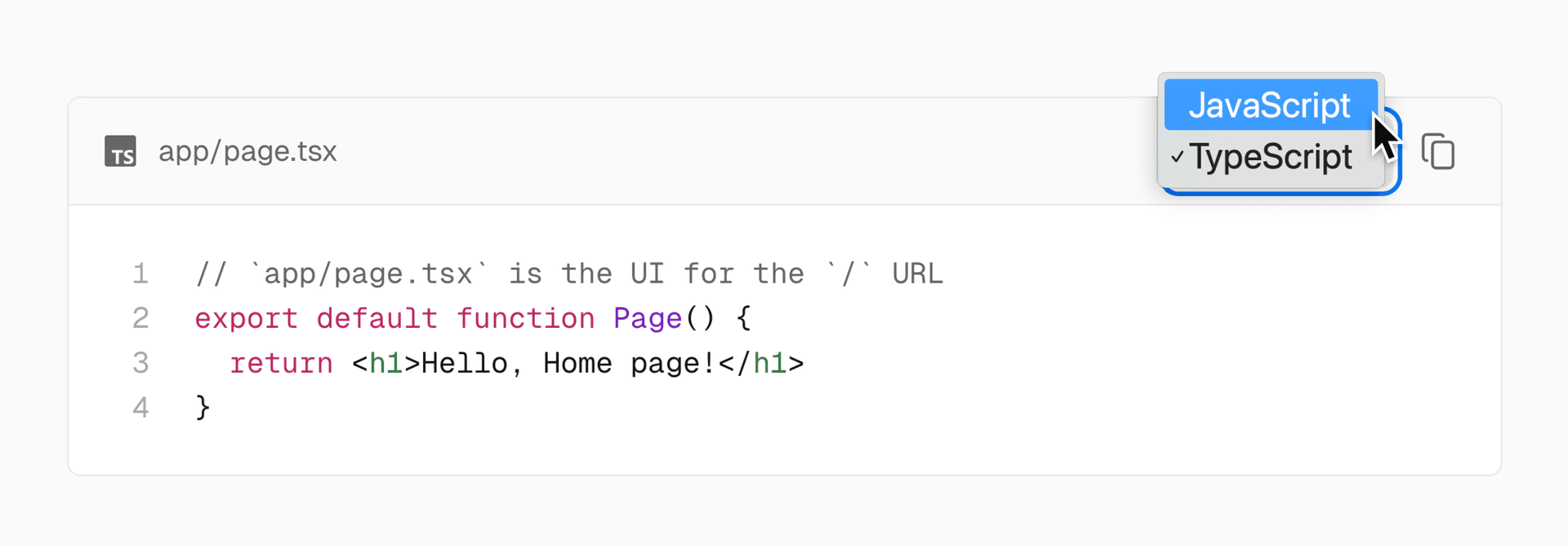 export function LanguagePicker({ setLanguage }) { return ( <select onChange={async (e) => { await interactionResponse(); setLanguage(e.target.value); }}> <option value="JS">JavaScript</option> <option value="TS">TypeScript</option> </select> );}Link to headingThe implementation
