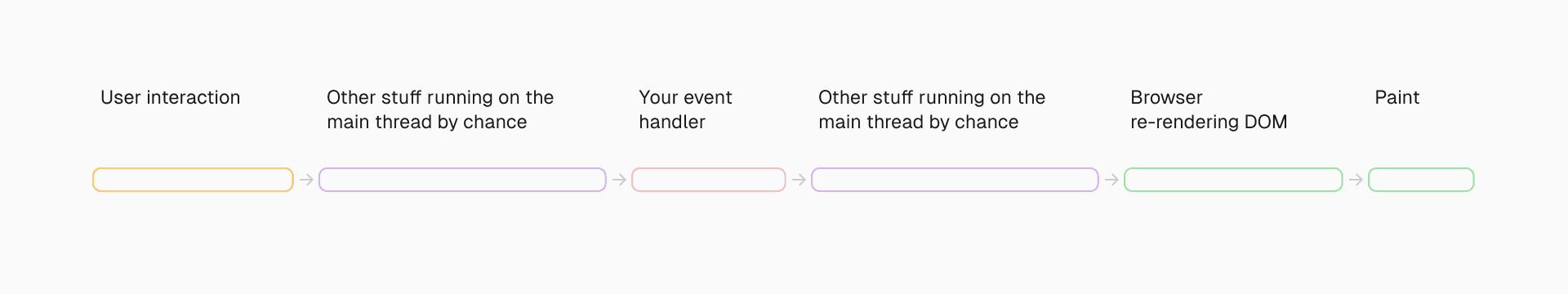 export function interactionResponse(): Promise<unknown> { return new Promise((resolve) => { setTimeout(resolve, 100); // Fallback for the case where the animation frame never fires. requestAnimationFrame(() => { setTimeout(resolve, 0); }); });}The code waits for an animation frame, but then also for a timeout. This allows the browser to paint the frame, and then immediately run the code. There is a backup timeout for the special case where the animation frame never runs, which is only relevant for extreme cases like the user moving to a different tab at just the right instant.