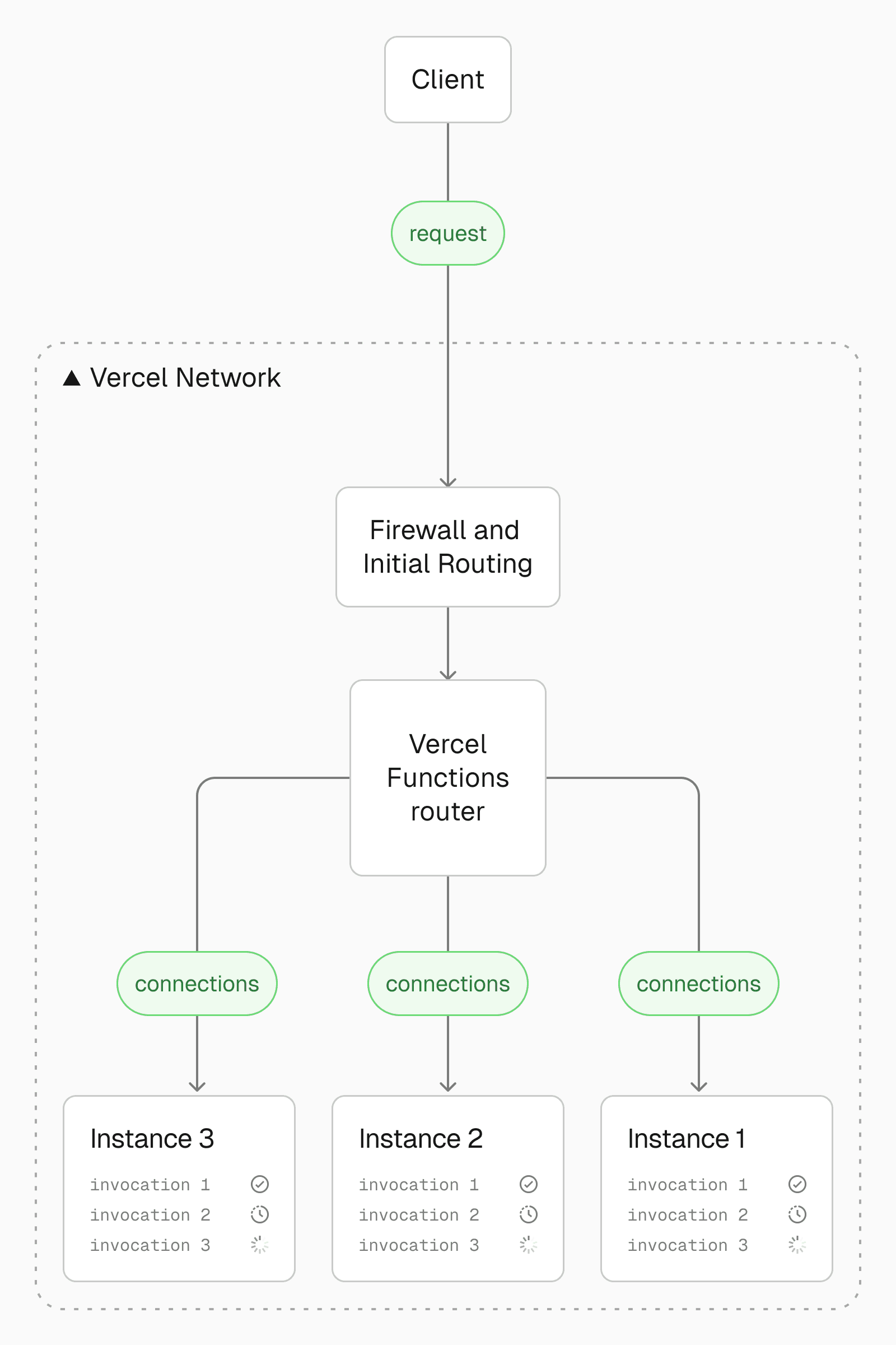 To address these inefficiencies, Fluid compute dynamically adjusts to traffic demands, reusing existing resources before provisioning new ones. At the center of Fluid is Vercel Functions router, which orchestrates function execution to minimize cold starts, maximize concurrency, and optimize resource usage. It dynamically routes invocations to pre-warmed or active instances, ensuring low-latency execution.