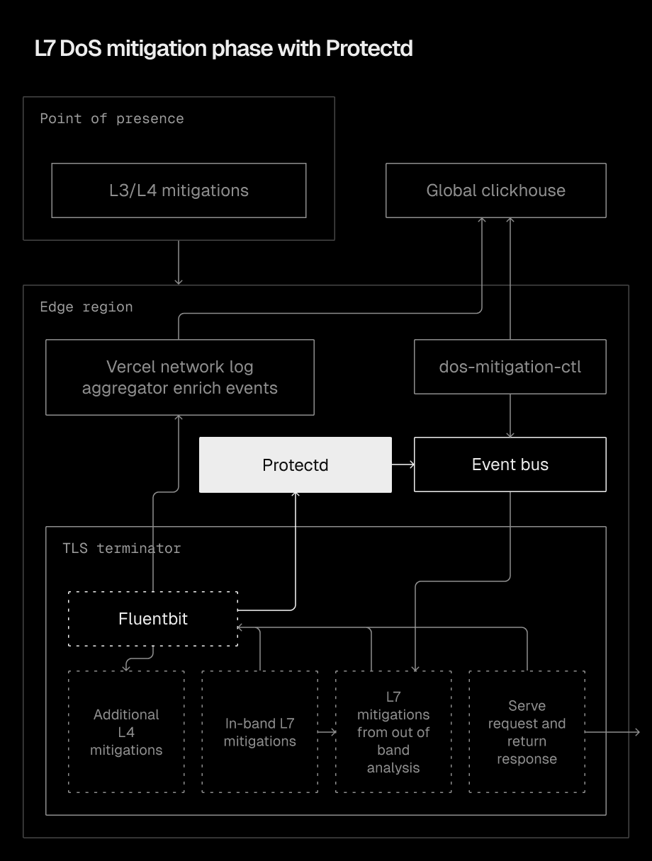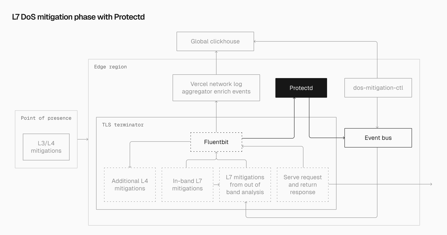 This original system reliably filtered high volumes of traffic and successfully mitigated a wide range of DoS attacks, but faced limitations. For out-of-bound mitigations, time to mitigation (TTM) often exceeded 20 seconds in our old system. When roughly 85% of all L7 protections depend on this pipeline, each passing second carries consequences. Vercel's infrastructure easily absorbs L7 floods, but prolonged attacks risk overwhelming customer backends and generating unwanted usage.