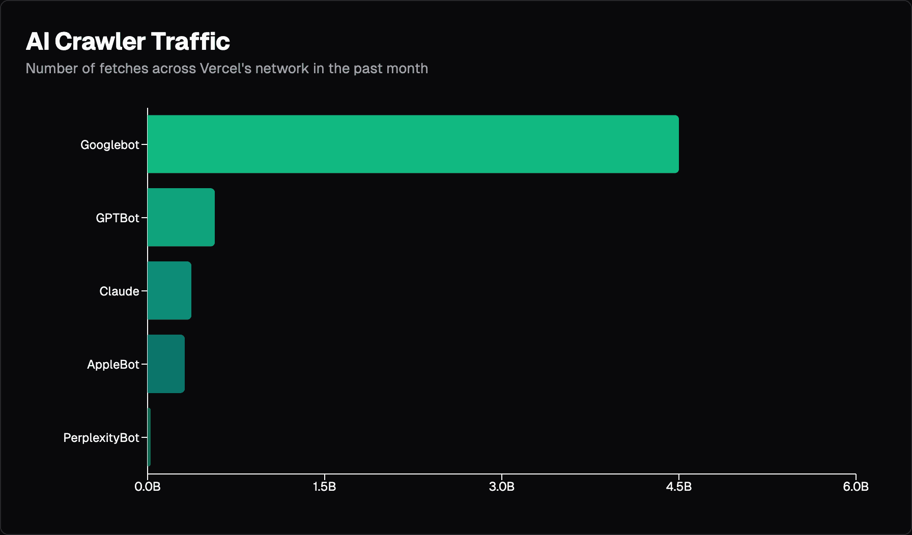 The volume of AI crawler traffic across Vercel's network is substantial. In the past month:
