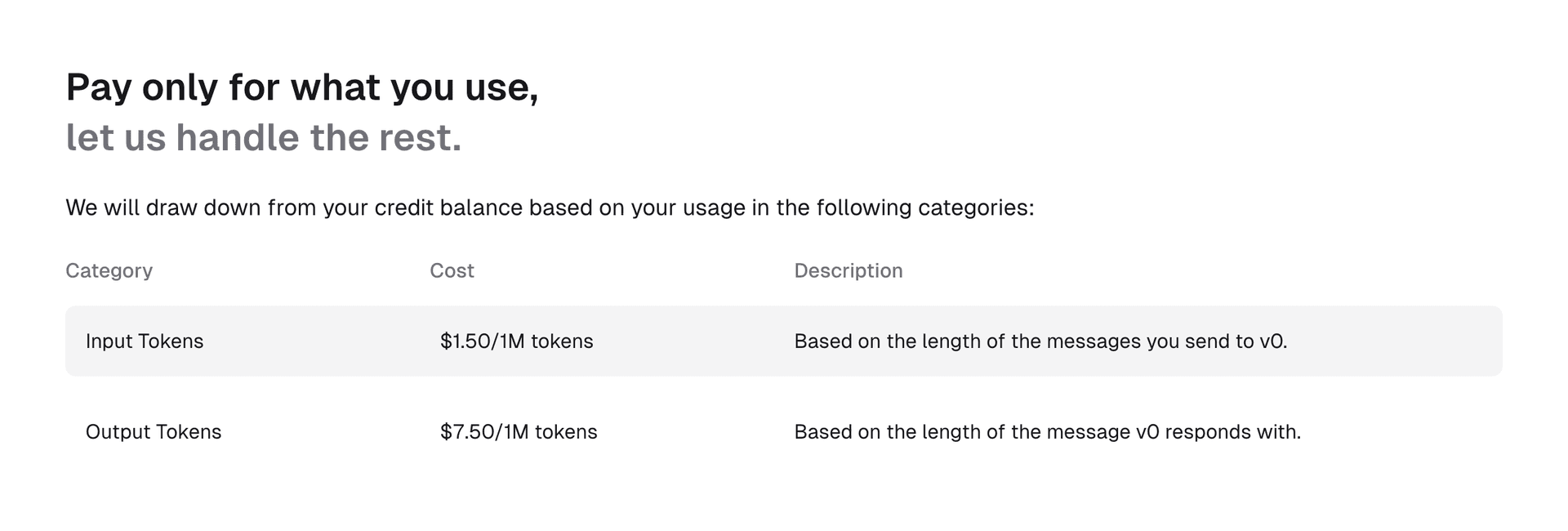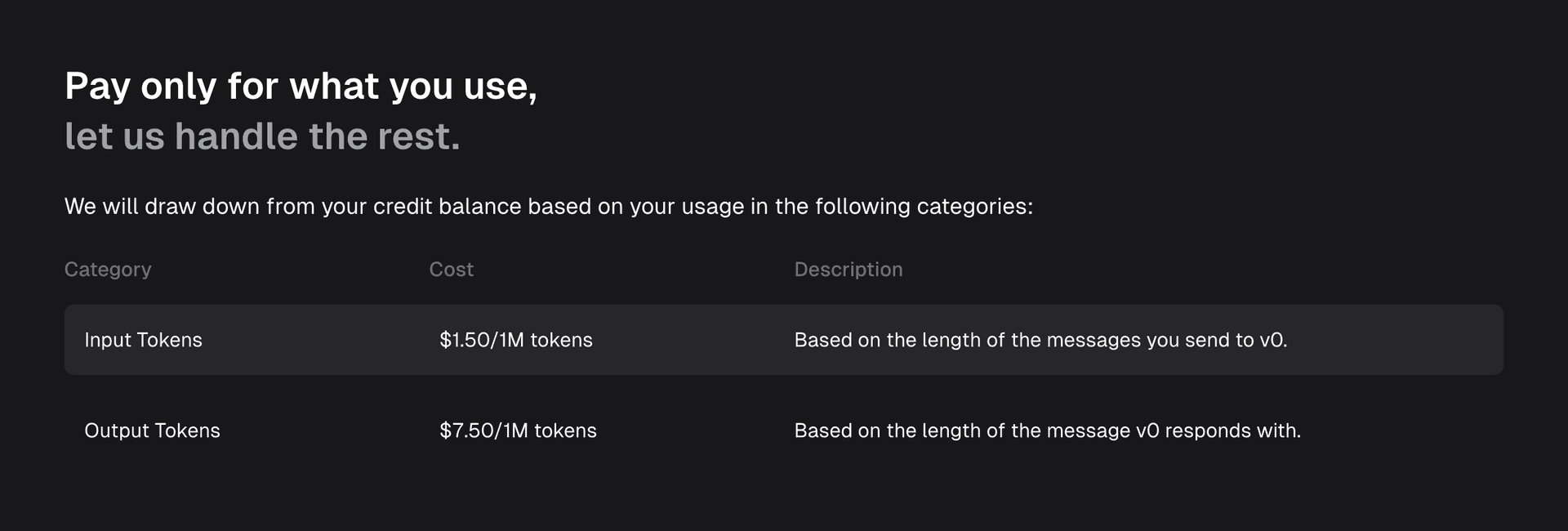 All new v0 usage, beginning today, will be metered in tokens. You can view the updated pricing on v0's pricing page.