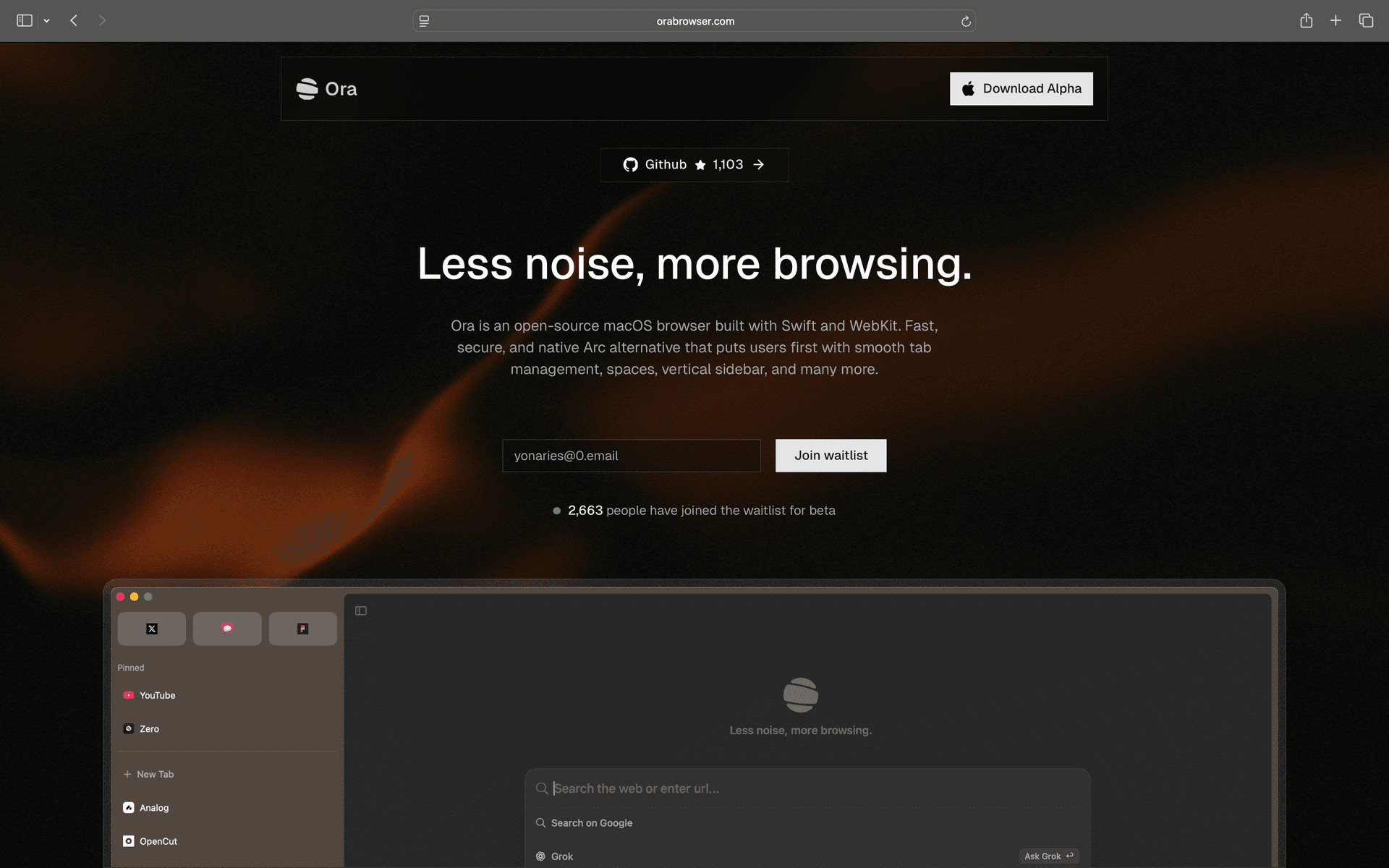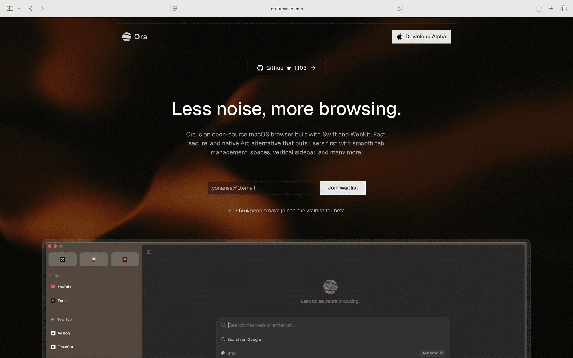 Ora is an open-source, Swift-built macOS browser aiming to deliver the Arc-style experience users want with native speed, isolation, and smooth tab management. Since launch, Ora has grown to 2,000+ Twitter followers, 960 GitHub stars, 19 contributors, and a 2,200-person waitlist.