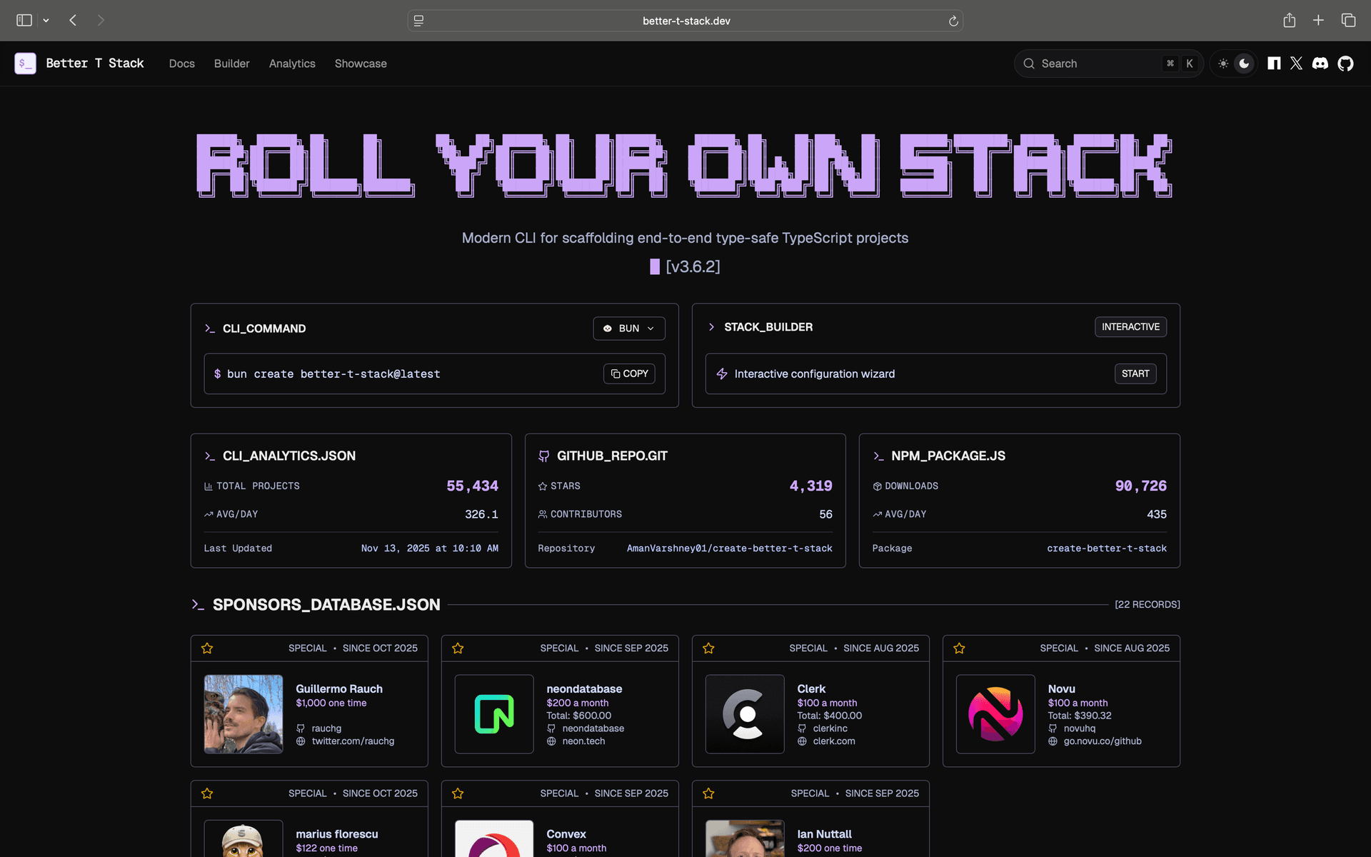 Better T Stack is a modern CLI for scaffolding fully type-safe TypeScript projects, supporting multiple frameworks and databases so developers can mix and match their entire stack in one flexible tool. It’s earned strong community love with 3.8K GitHub stars, 60K+ npm downloads, 40K+ created projects, and sponsorship from companies like Convex, Neon, Better Stack, Clerk, and more.