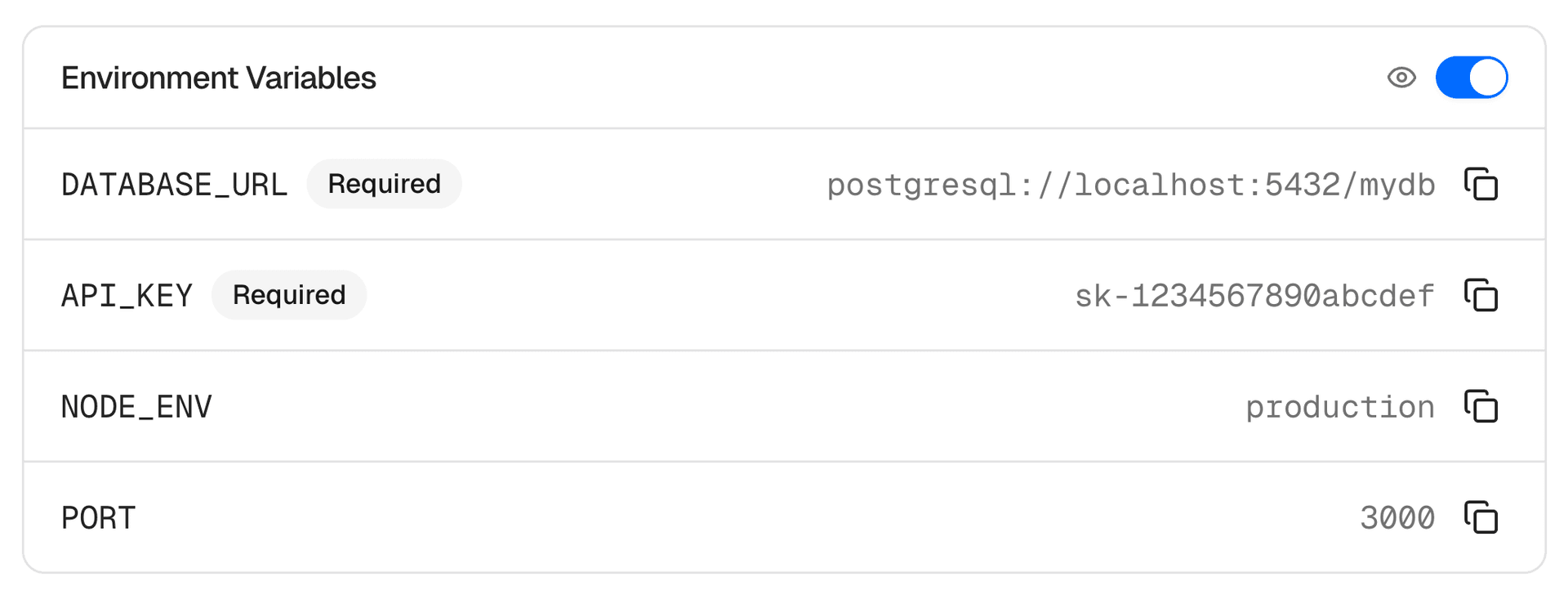 The EnvironmentVariables component displays environment variables with value masking, visibility toggle, and copy functionality.