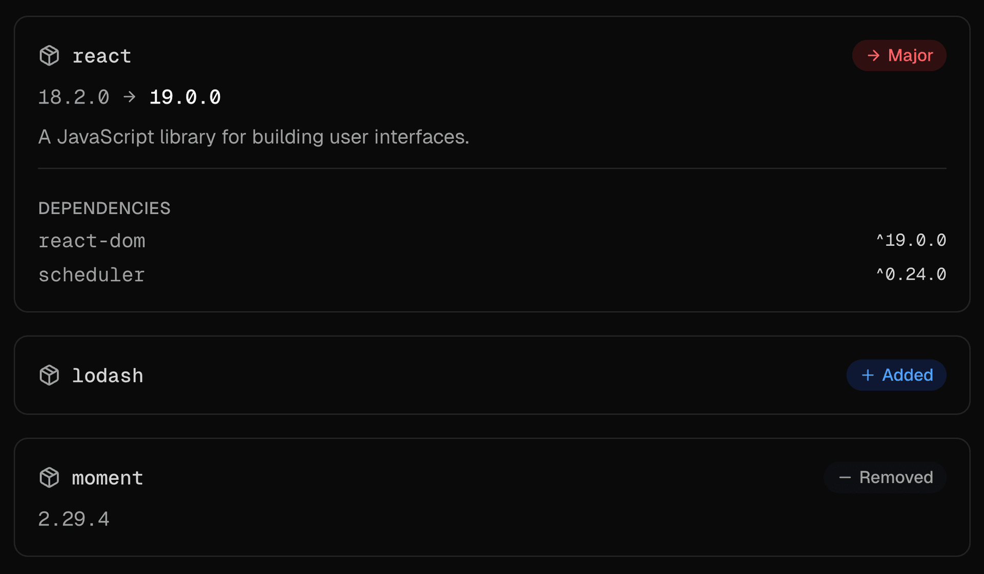 The PackageInfo component displays package dependency information including version changes and change type badges.