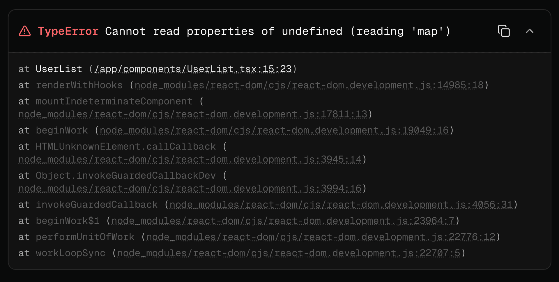 The StackTrace component displays formatted JavaScript/Node.js error stack traces with clickable file paths, internal frame dimming, and collapsible content.