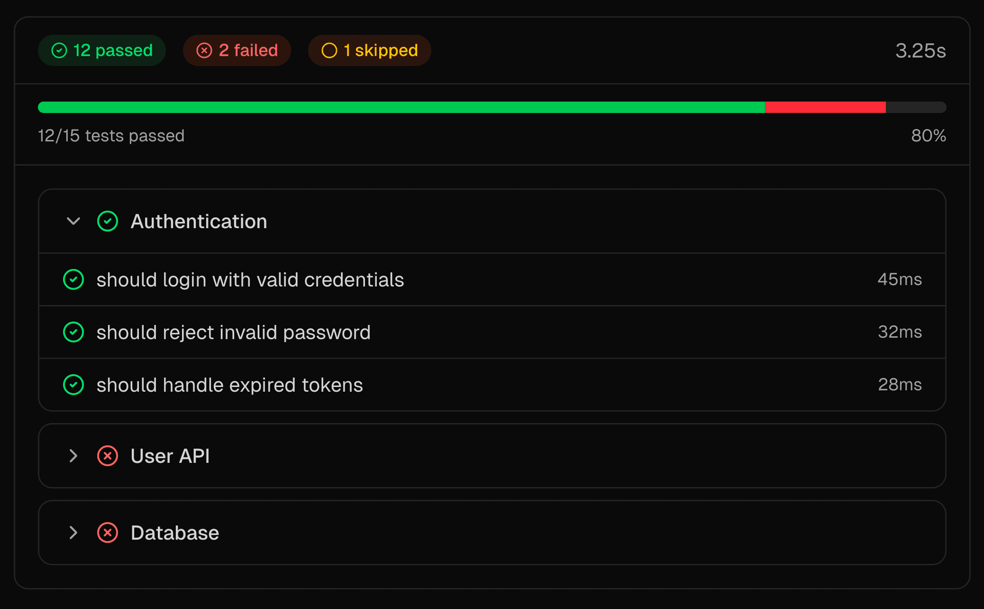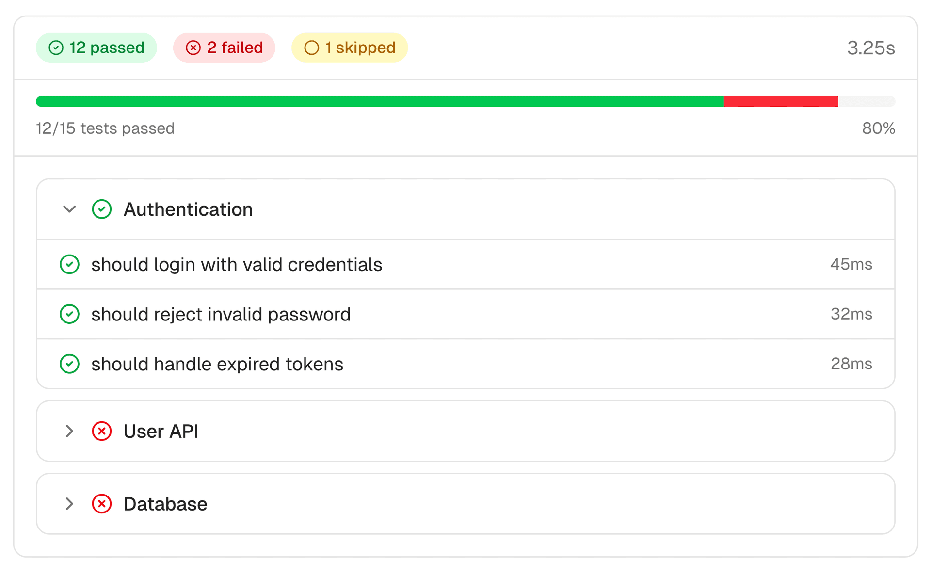 The TestResults component displays test suite results (like Vitest) including summary statistics, progress, individual tests, and error details.