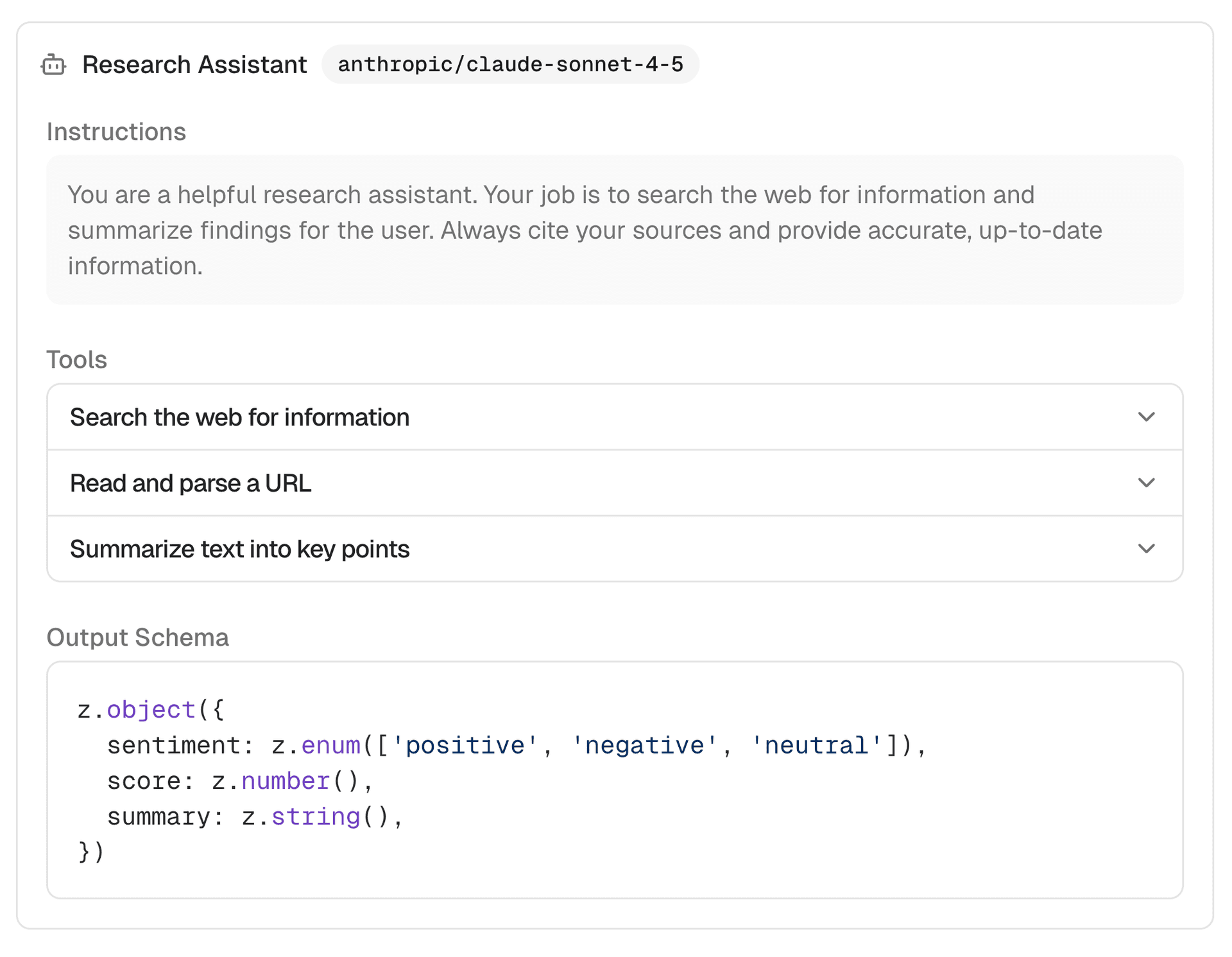 A composable component for displaying an AI SDK ToolLoopAgent configuration with model, instructions, tools, and output schema.