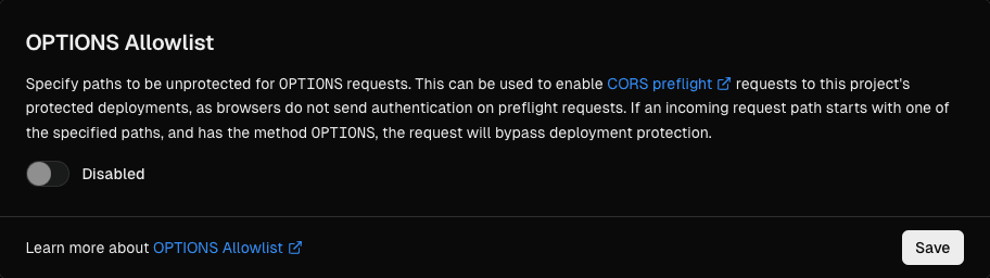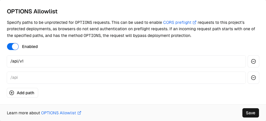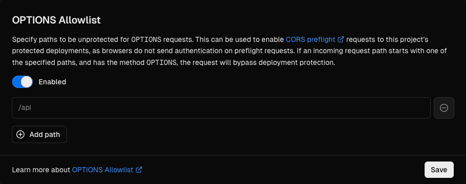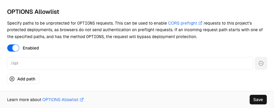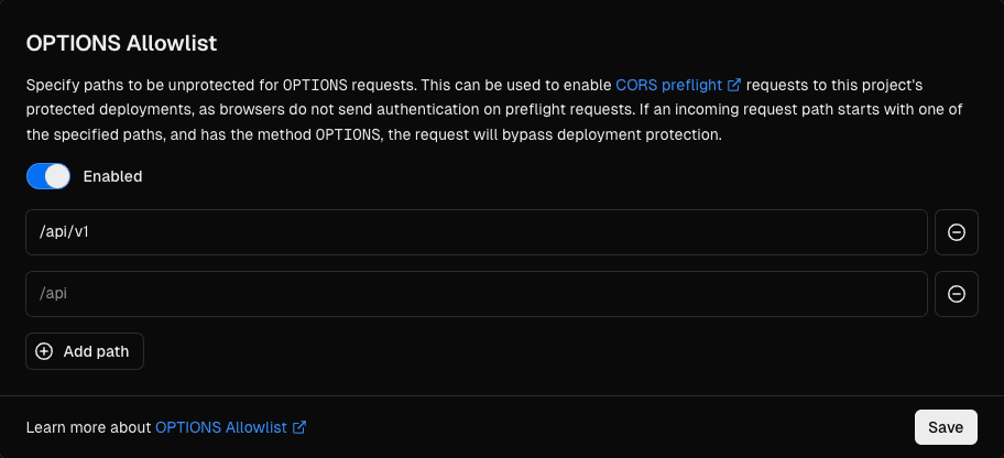 When you add a path to OPTIONS Allowlist, any incoming request with the method OPTIONS that starts with the path will no longer be covered by Deployment Protection. When you remove a path from OPTIONS Allowlist, the path becomes protected again with the project's Deployment Protection settings.