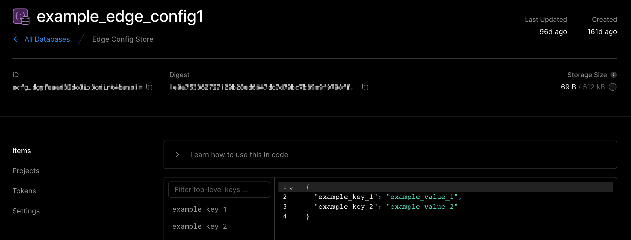 The default view of the Edge Config's detail page shows the list of all items in the store. You will see an open accordion titled Learn how to use this in code if the Edge Config is connected to at least one project. This accordion provides the steps with a code example on how to read your store items.