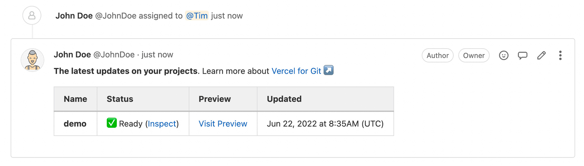 By default, comments from the Vercel bot will appear on your pull requests and commits. You can silence these comments in your project's settings: