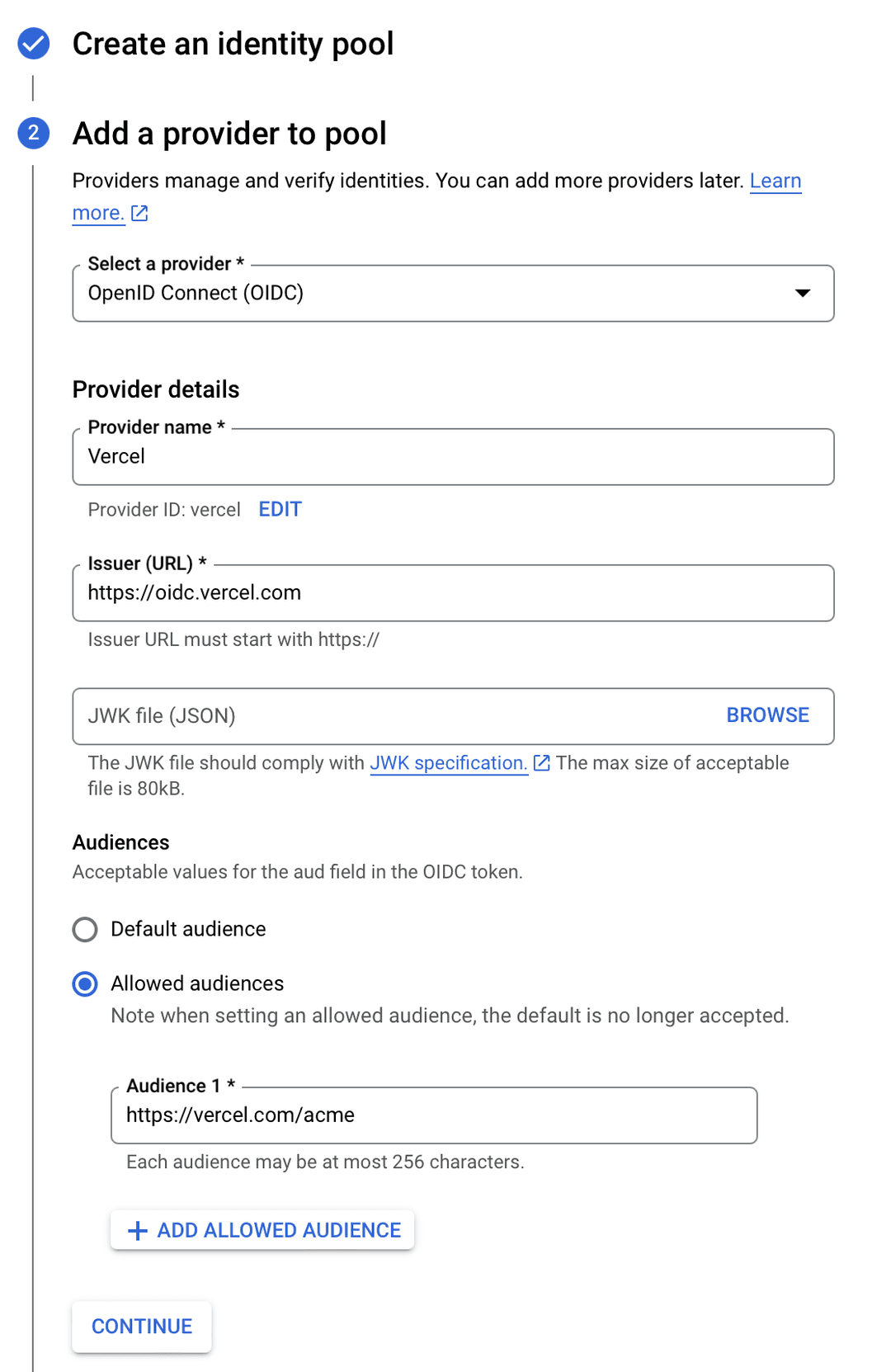 audience: `//iam.googleapis.com/projects/${GCP_PROJECT_NUMBER}/locations/global/workloadIdentityPools/${GCP_WORKLOAD_IDENTITY_POOL_ID}/providers/${GCP_WORKLOAD_IDENTITY_POOL_PROVIDER_ID}`,