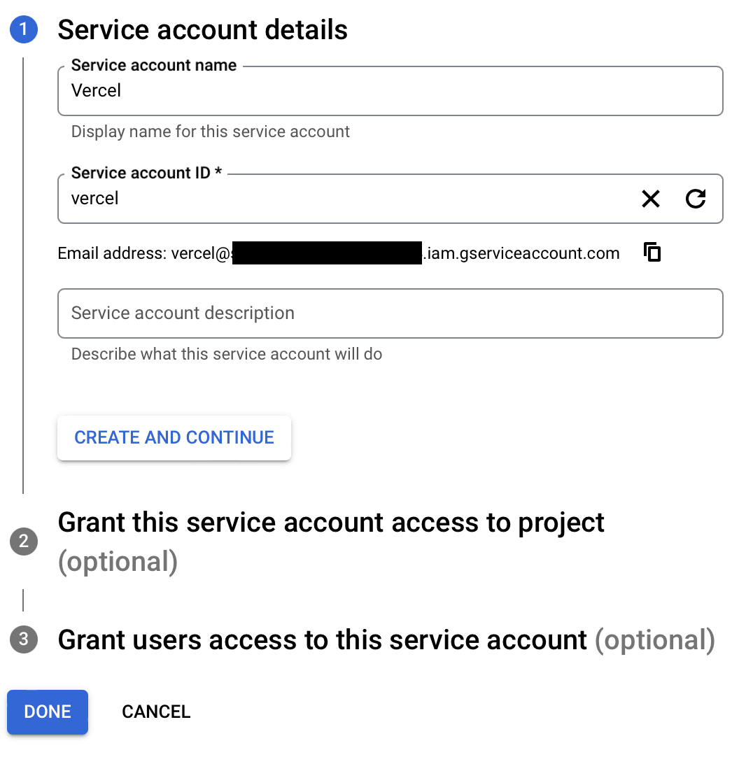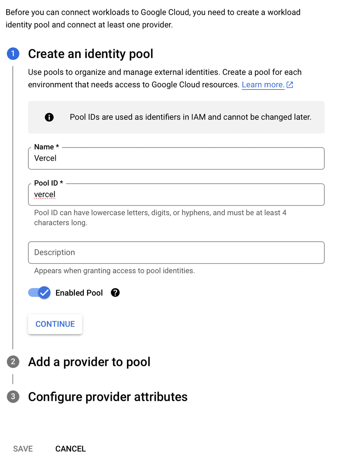 Value Location Environment Variable Example Project ID IAM & Admin -> Settings GCP_PROJECT_IDmy-project-123456Project Number IAM & Admin -> Settings GCP_PROJECT_NUMBER1234567890Service Account Email IAM & Admin -> Service Accounts GCP_SERVICE_ACCOUNT_EMAILvercel@my-project-123456.iam.gserviceaccount.comWorkload Identity Pool ID IAM & Admin -> Workload Identity Federation -> Pools GCP_WORKLOAD_IDENTITY_POOL_IDvercelWorkload Identity Pool Provider ID IAM & Admin -> Workload Identity Federation -> Pools -> Providers GCP_WORKLOAD_IDENTITY_POOL_PROVIDER_IDvercelThen, declare them as environment variables in your Vercel project.
