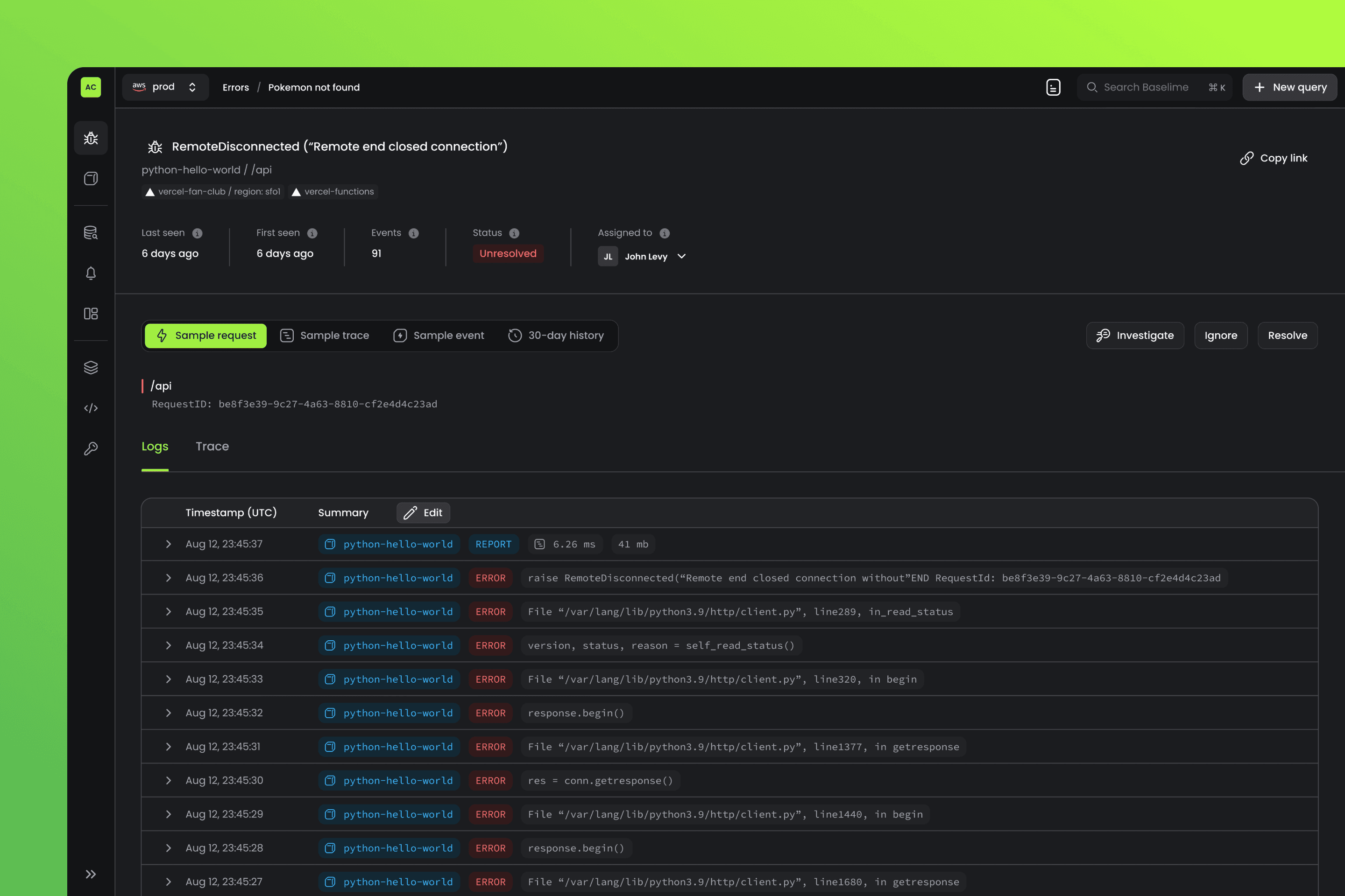 Debug and troubleshoot your Vercel apps faster with Baselime’s Vercel integration. This integration automatically captures logs from your Vercel apps and enables you to: