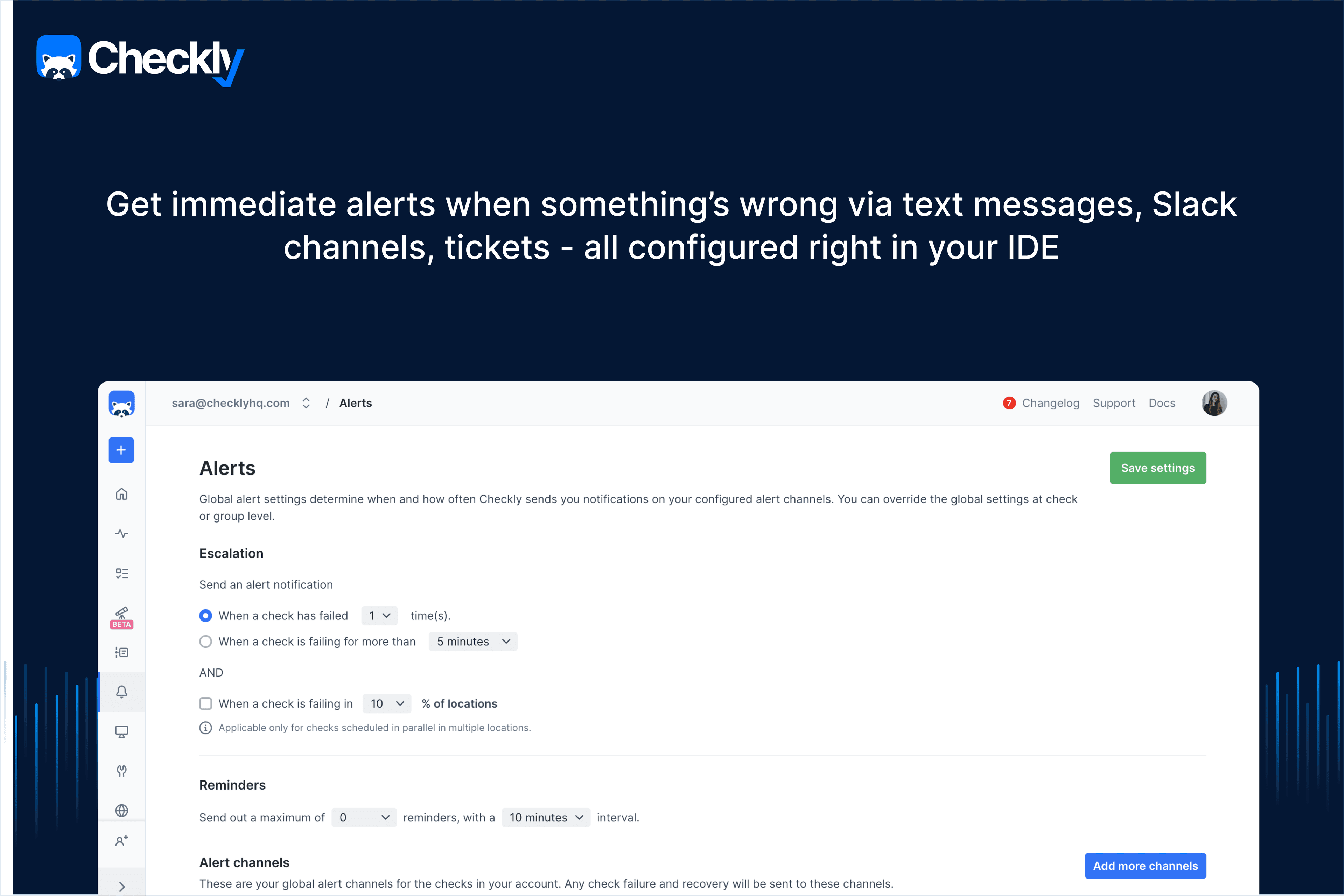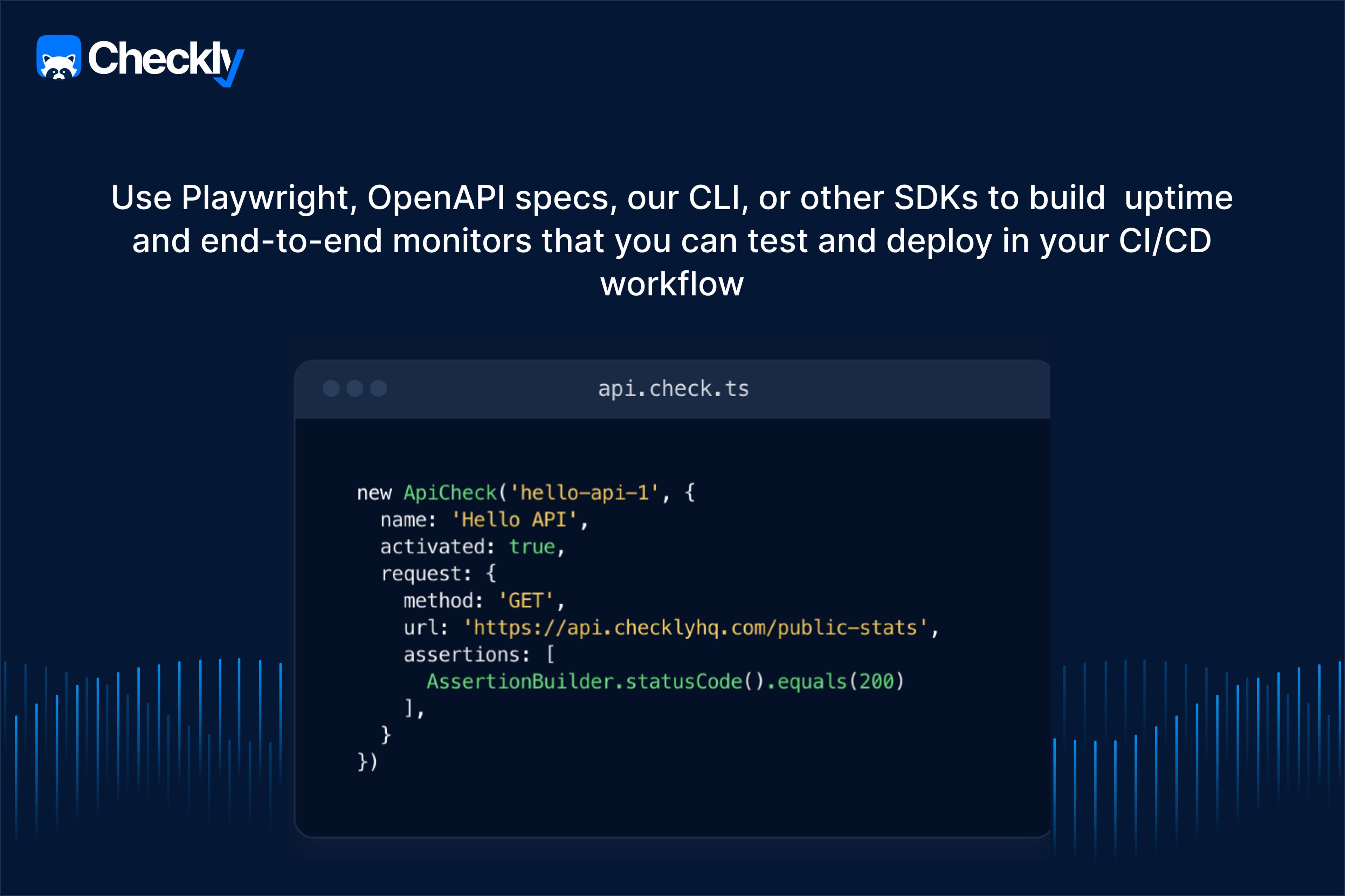Monitoring as Code: Define & manage monitors using Terraform, JavaScript SDKs, or Checkly CLI. Monitoring is version-controlled and scalable alongside your application.