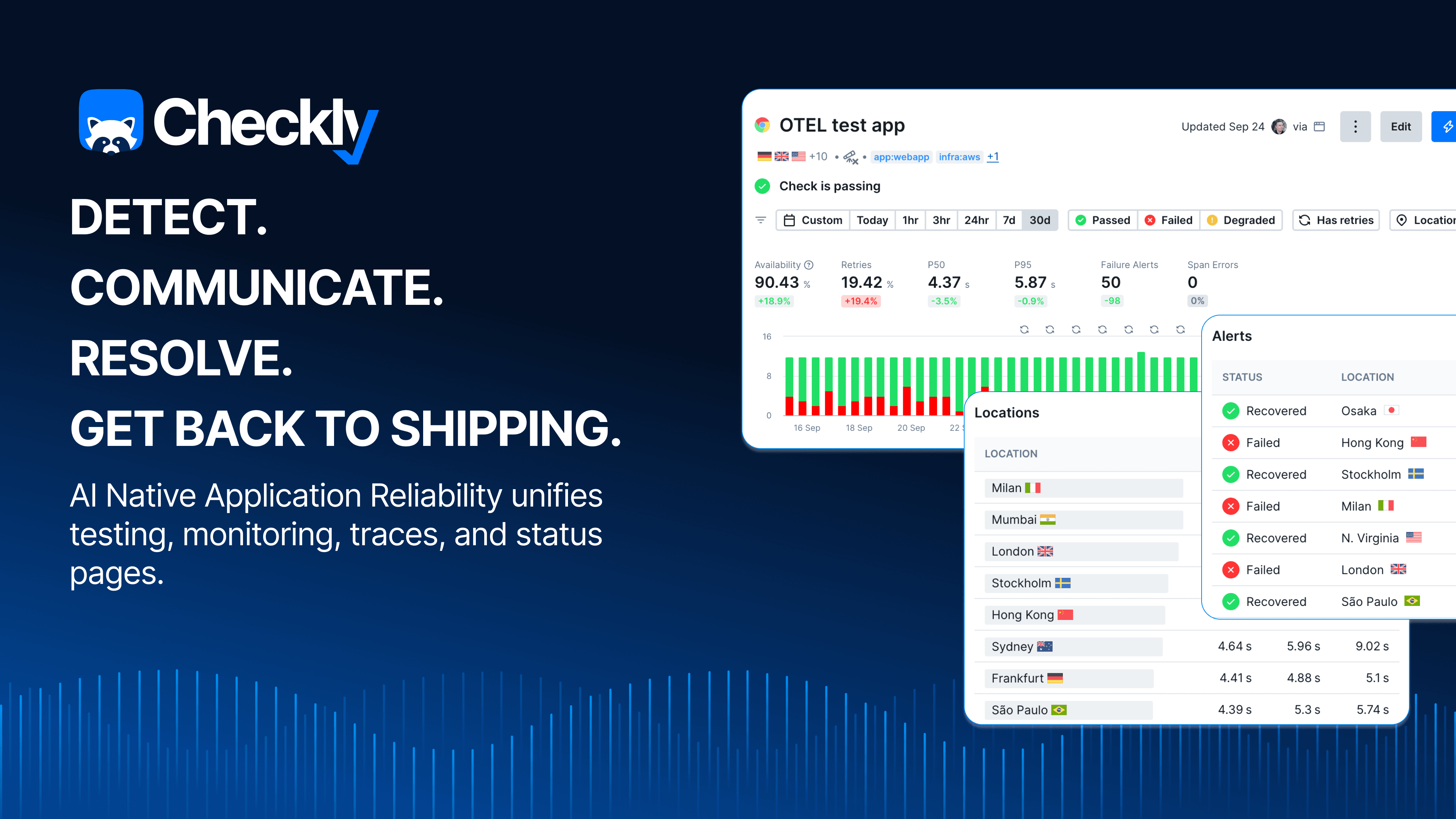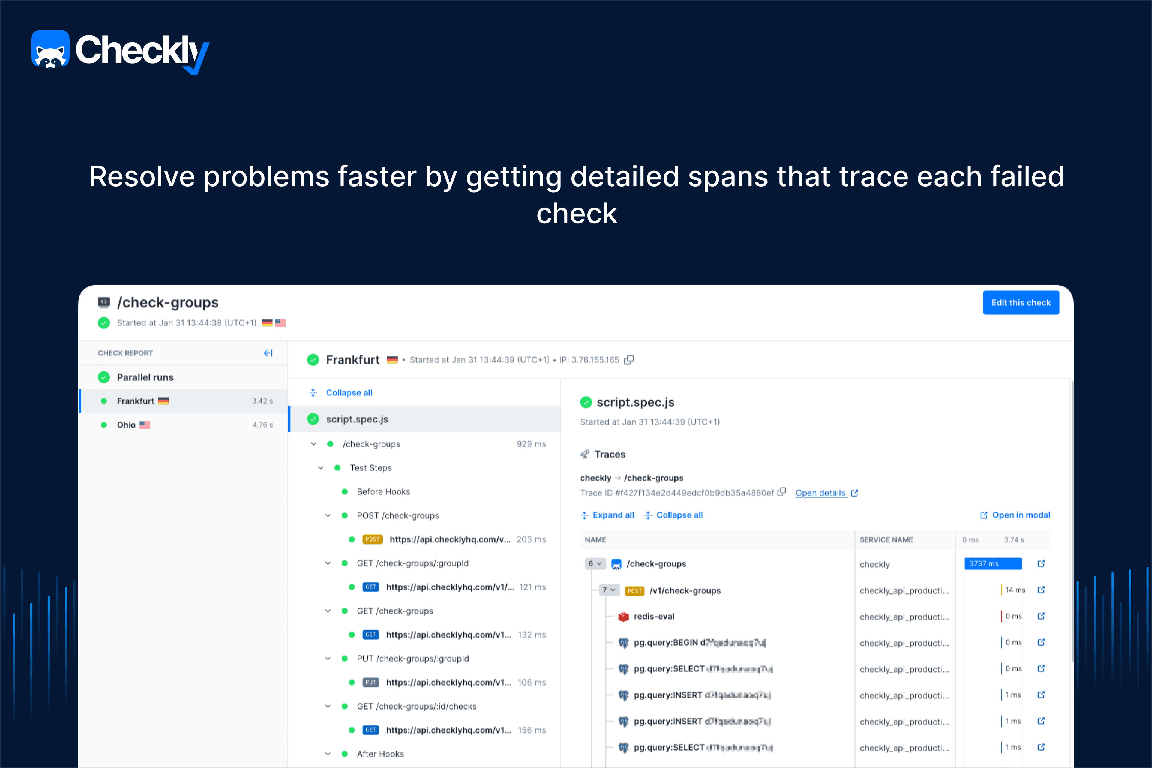 Observability with OpenTelemetry: Gain insights into application performance by connecting Checkly with OpenTelemetry tracing, providing full visibility into failures.