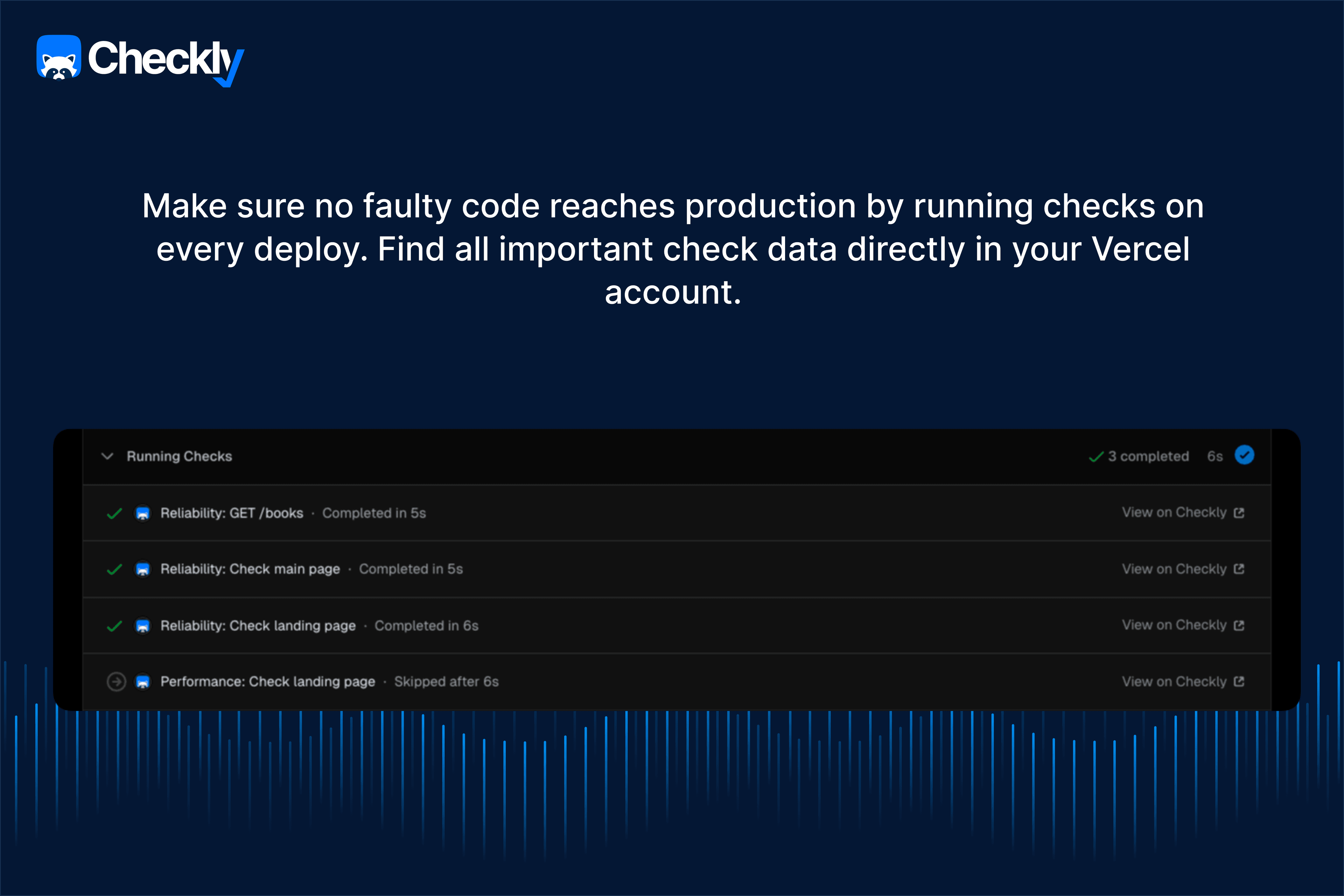 Checkly enables organizations to unify testing, monitoring, observability, and incident management into a coded workflow. Checkly's approach of monitoring as code enables organizations to automate & scale their testing and monitoring using LLMs or hosting provider's like Vercel like never before: