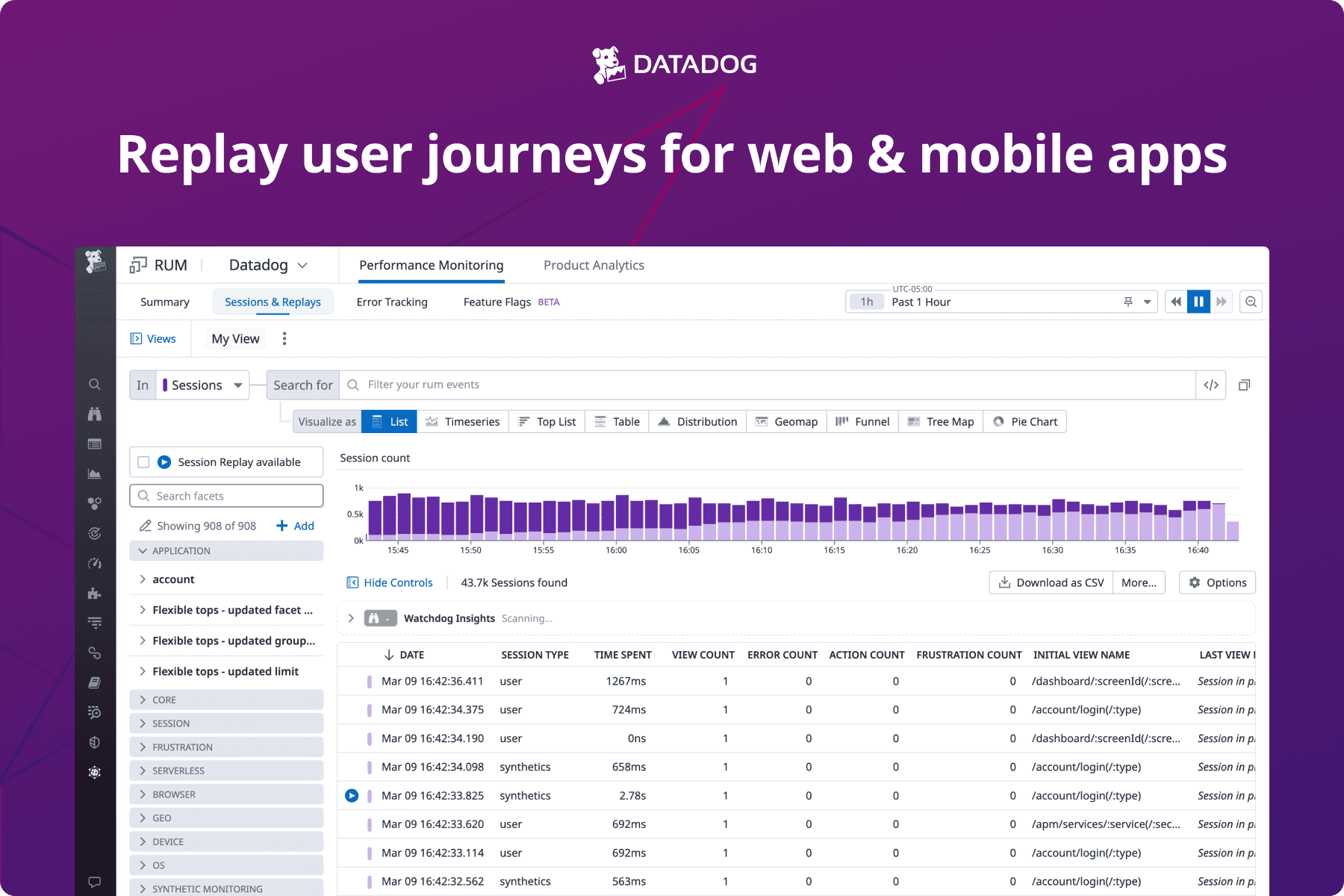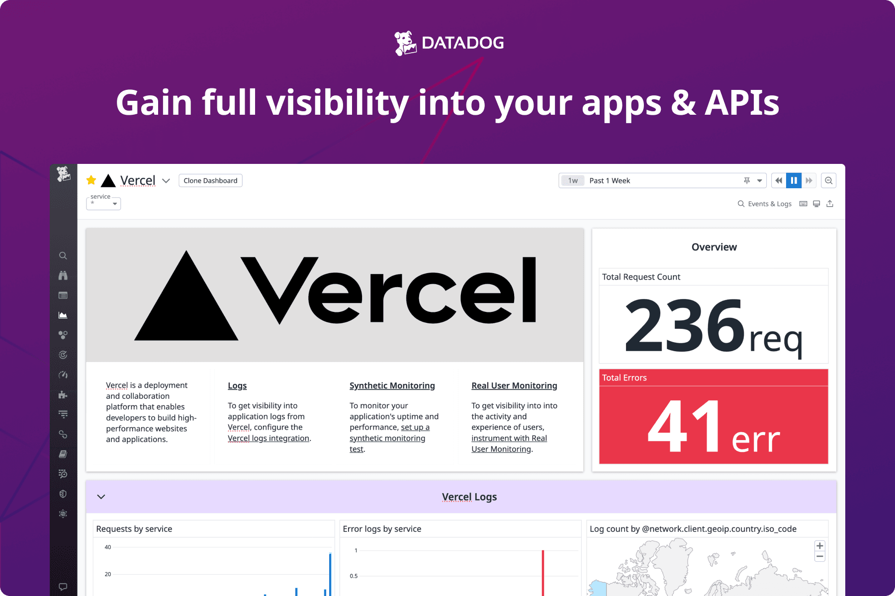 Datadog’s Vercel integration enables you to ingest your functions’ logs for analysis and storage. Datadog also provides Real User Monitoring to monitor performance and understand user behavior, which can be integrated into and Synthetic Monitoring which can be integrated directly with your applications.
