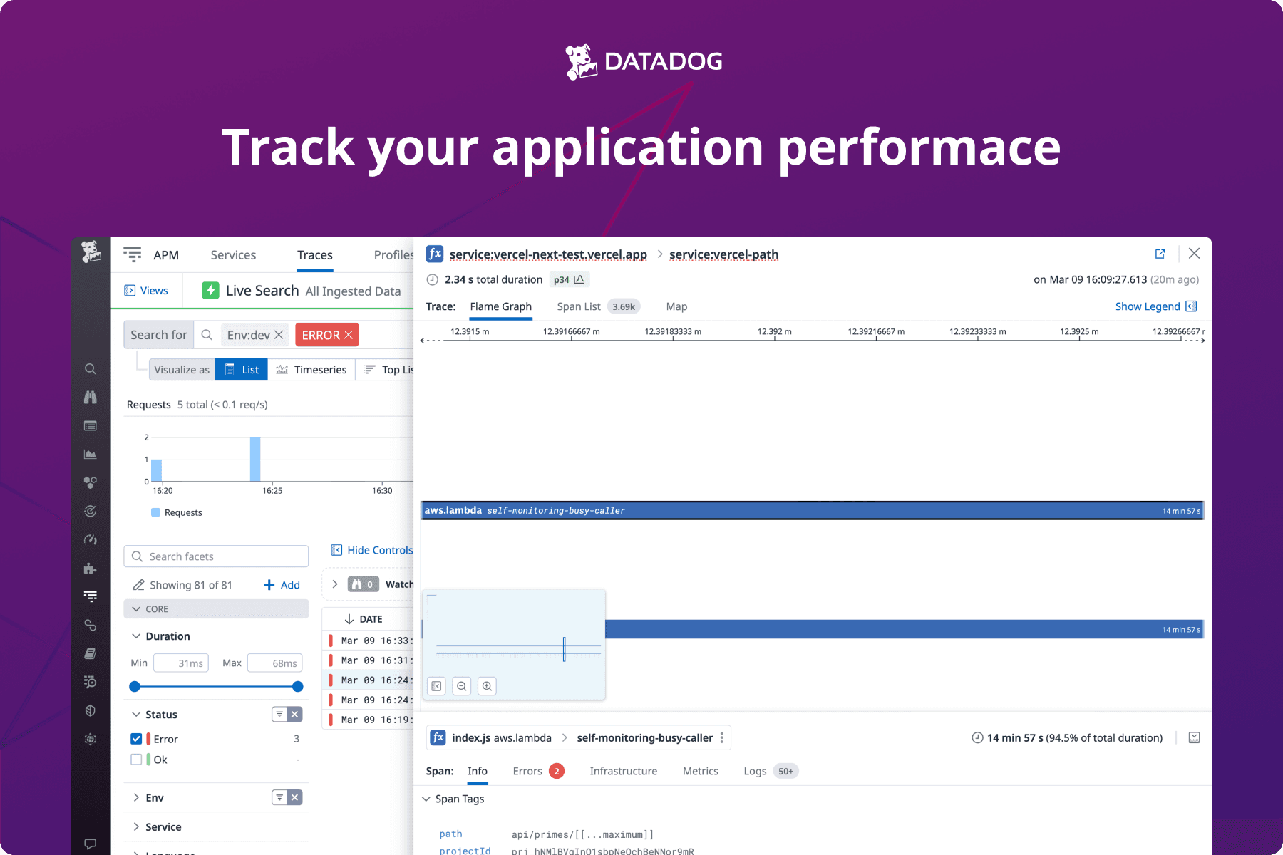 Datadog APM enables you to visualize and understand the performance of your Vercel functions in depth. Get code-level insights and conduct targeted root cause analysis to understand how your functions are interacting with downstream services.