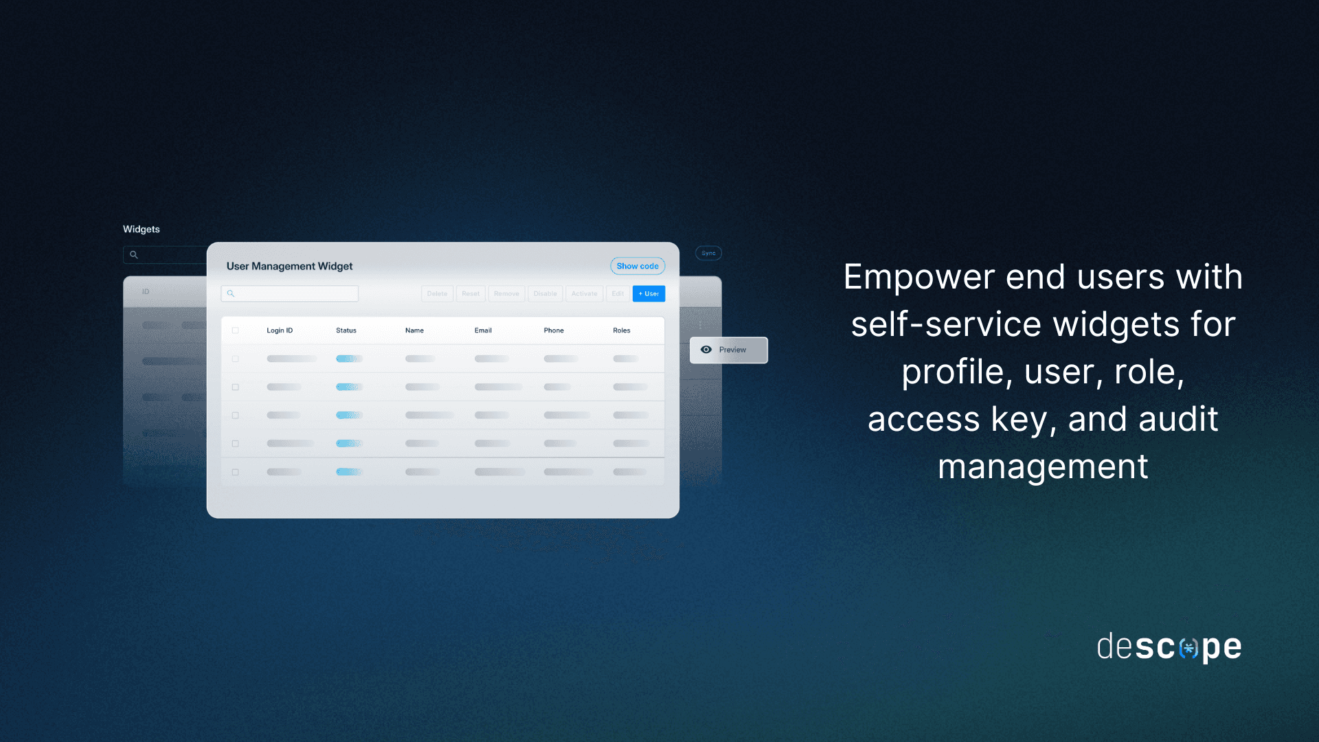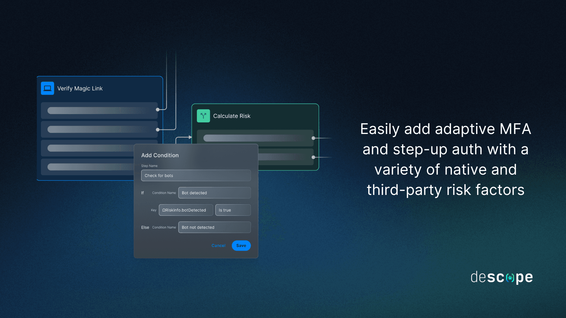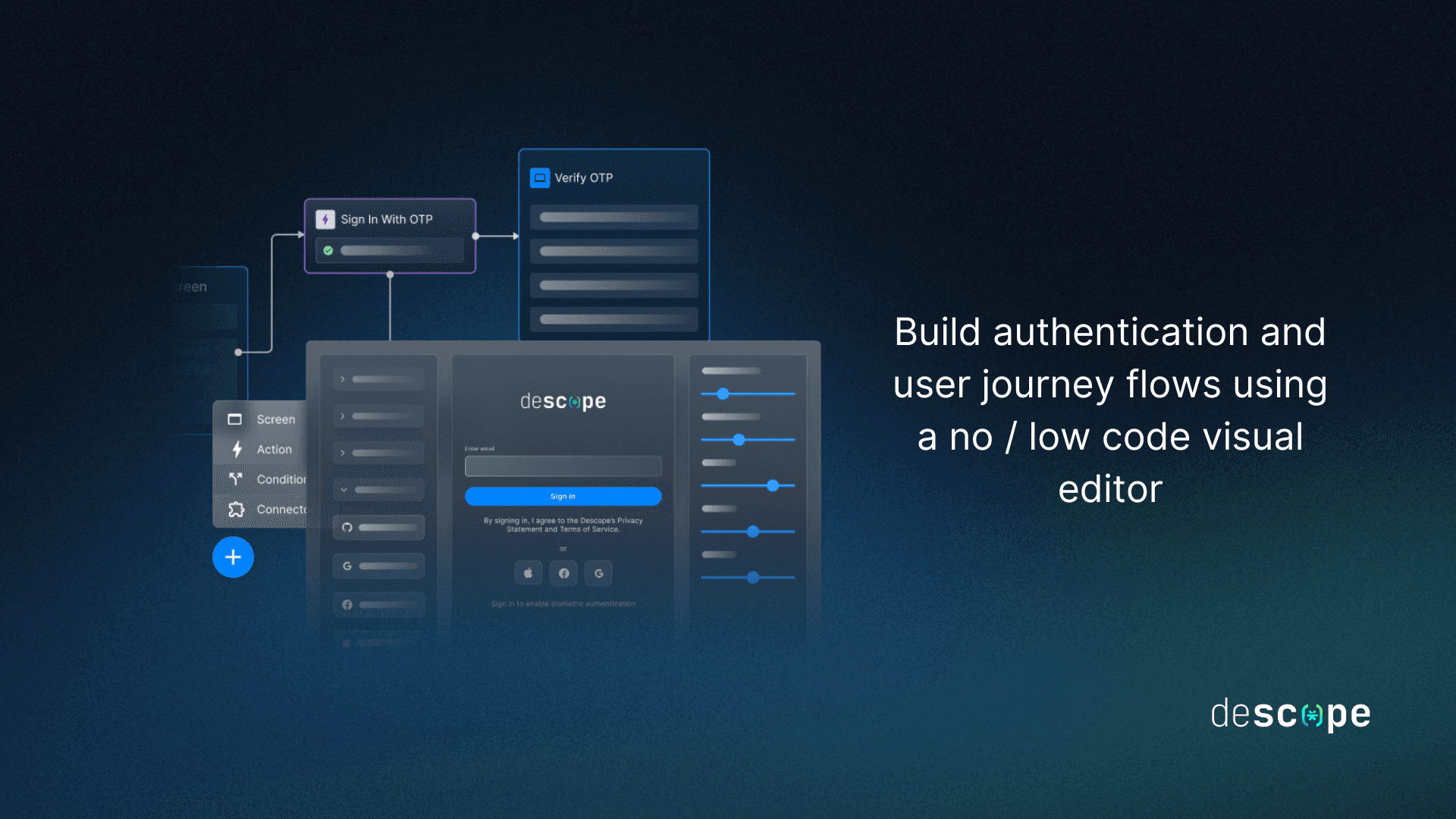 Descope is a drag & drop authentication and user management platform for developers. With our no-code workflows, you can easily create and customize user-facing screens, authentication flows, MFA and step-up controls, SSO, and more for your consumer or business apps.