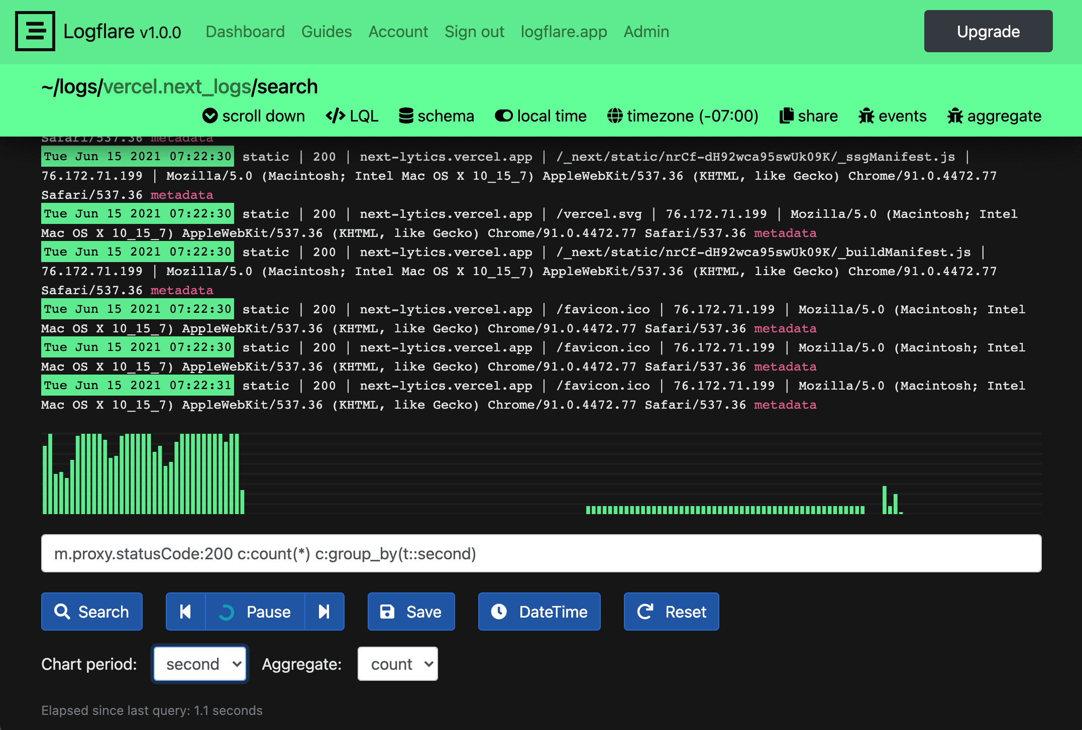 Logflare’s pricing structure includes 12.9M free log events per month and expands on what’s available in Vercel. Features include: