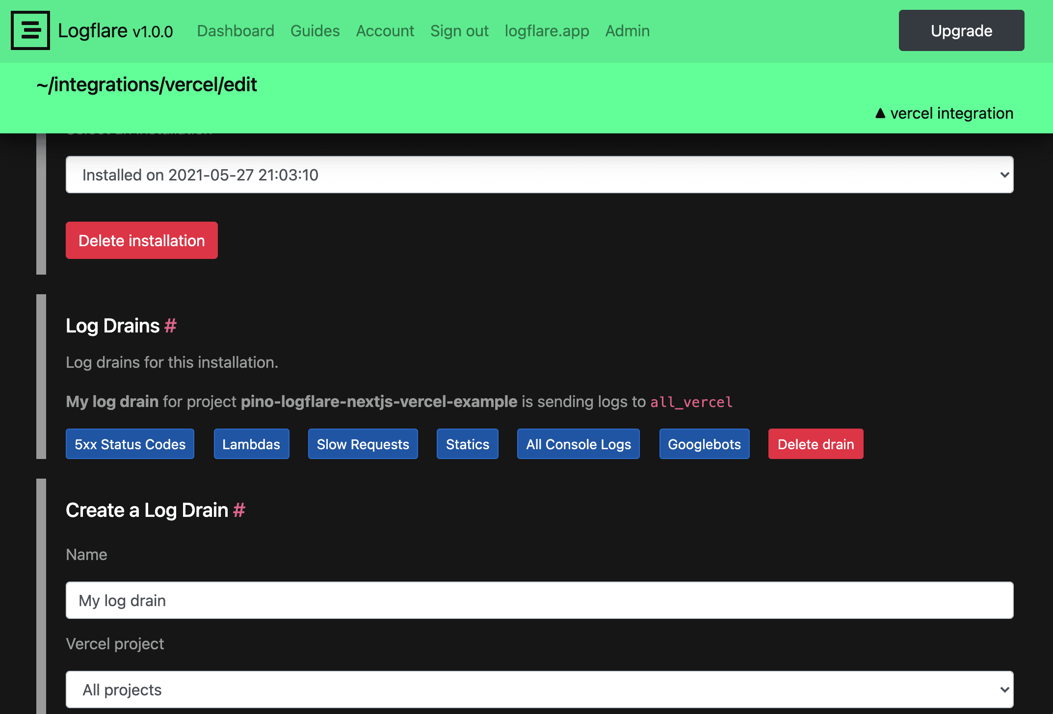 Add log and app performance management to your Vercel project with Logflare. This integration works on top of Vercel’s log drains to make it easy for you to get your logs into your Logflare account.