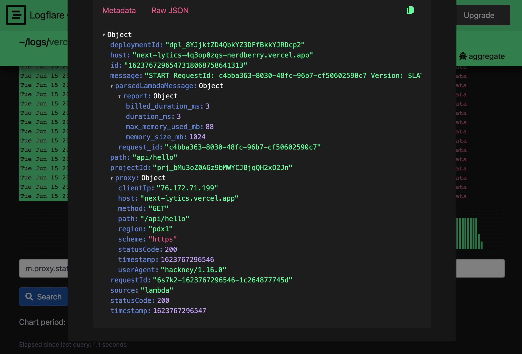 Vercel wraps all your console logs in the context of the request. They're buried in the message in your log event metadata. This is the stdout dump from your lambda runs. AWS gives us some metadata about the request in the report section along with the stdout string.