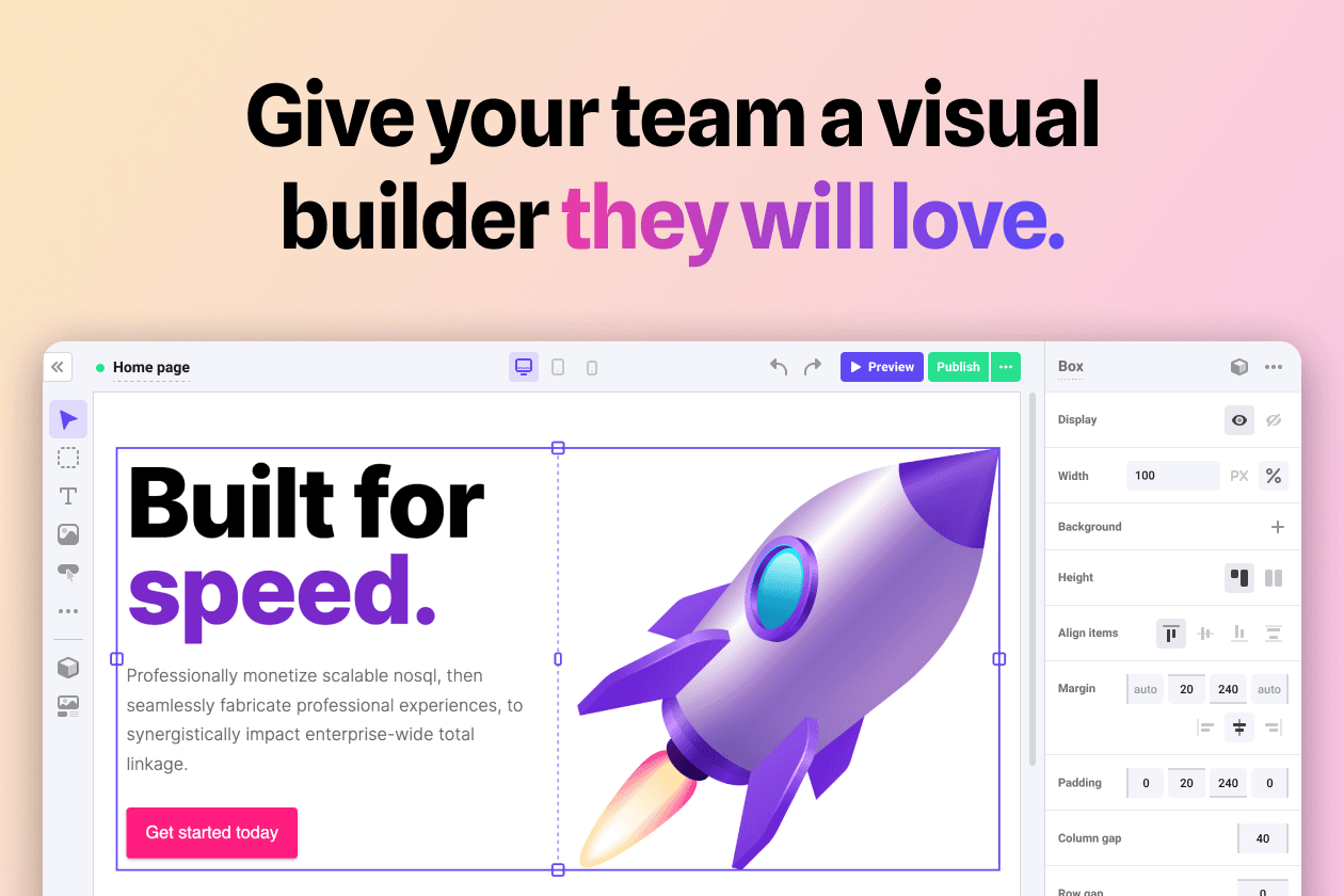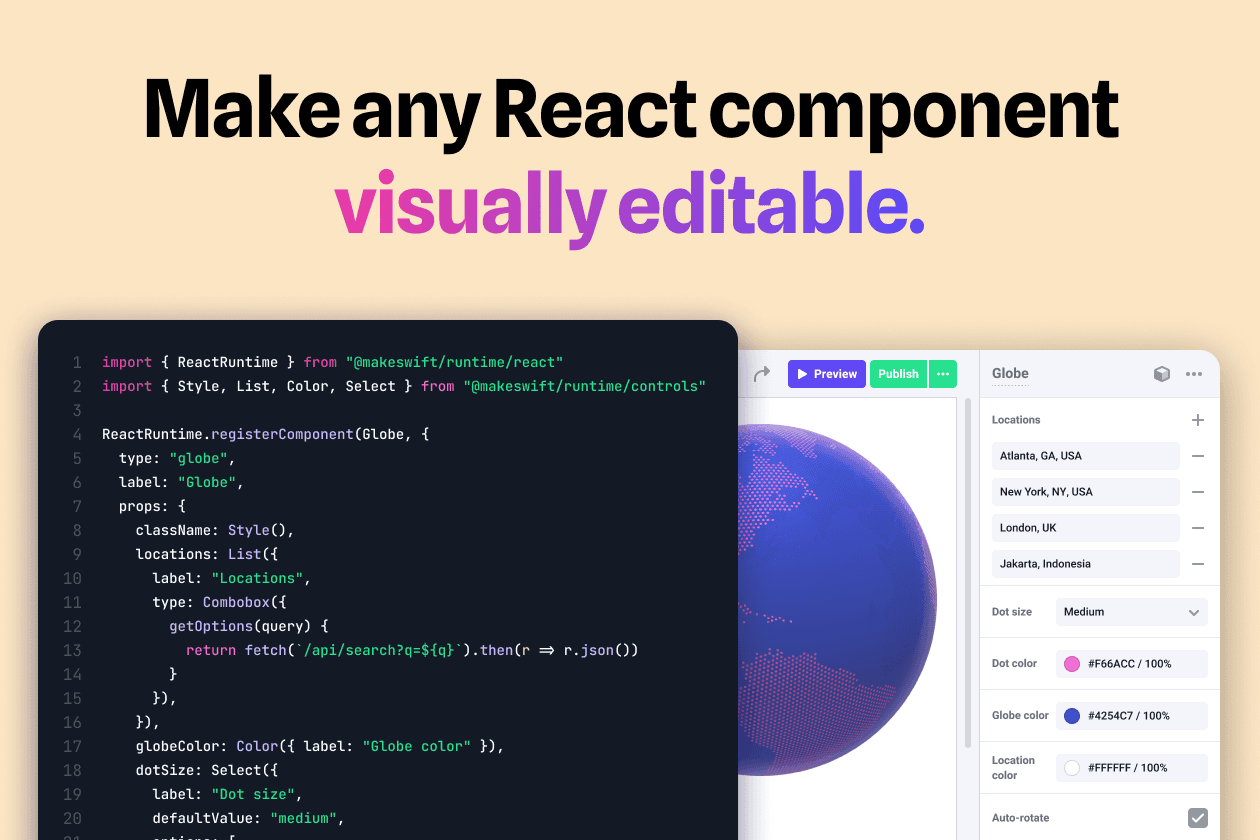Makeswift is a composable layout and content management system that gives marketers and designers visual control of modern websites. With Makeswift, engineers can give marketers custom building blocks by integrating React components into Makeswift’s visual builder. Makeswift integrates into your codebase like a headless CMS, but the difference is marketers and designers can use our no code builder for the majority of their content and layout needs out of the box, only having to rely on engineering for isolated custom component development.