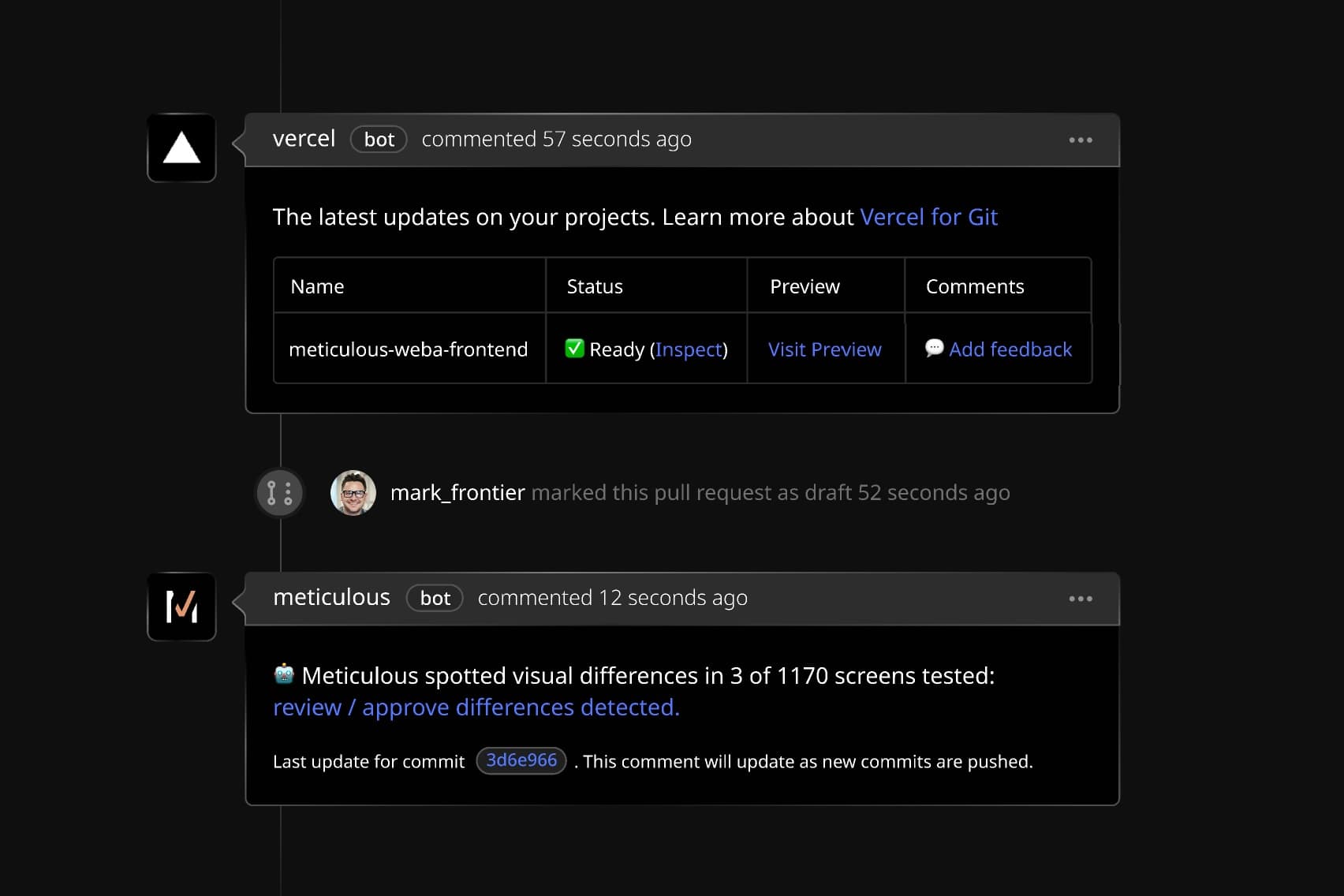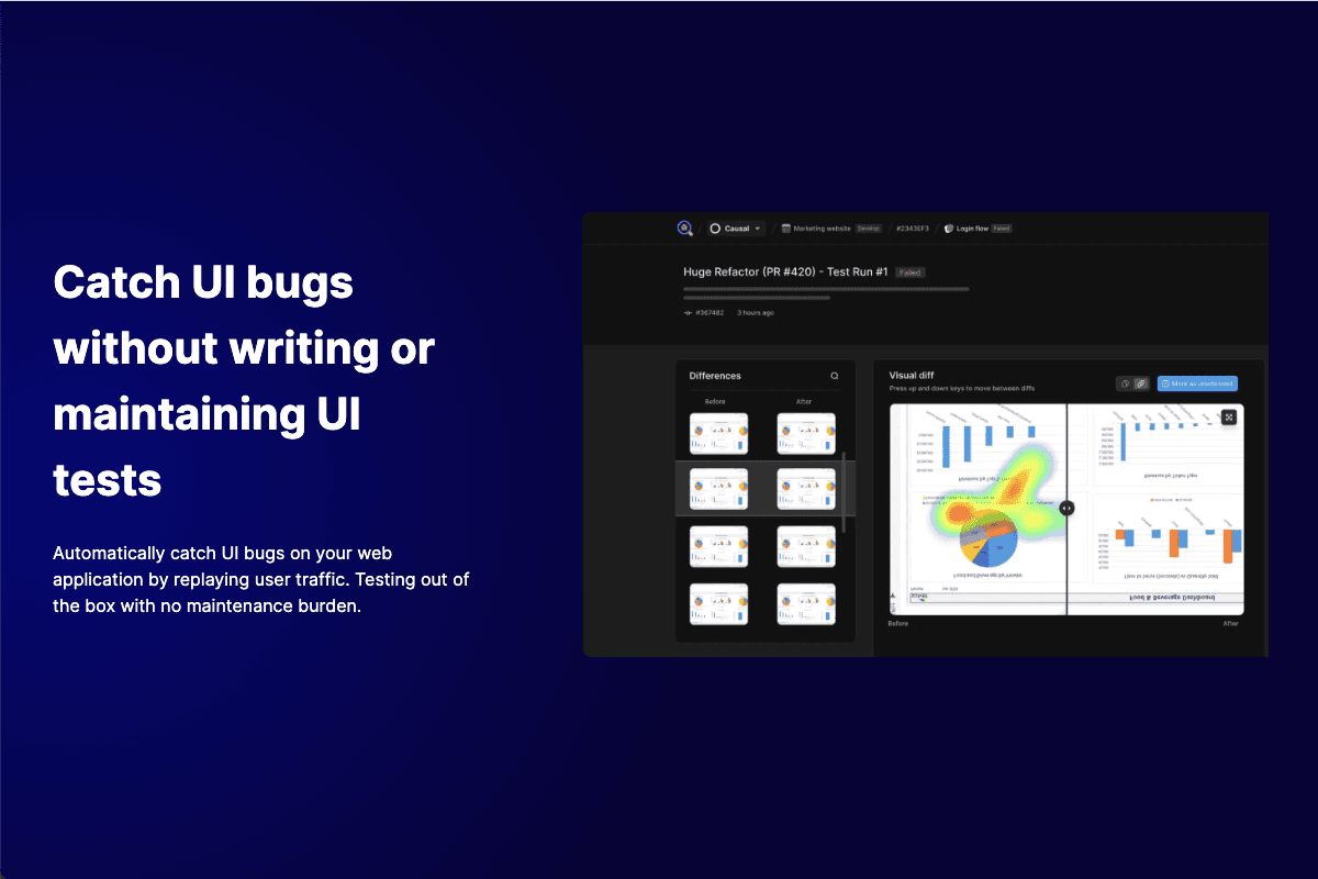 Meticulous.ai captures your natural testing sessions — on localhost, preview URLs and staging stacks — and uses these to generate a test suite that covers every corner of your app, testing all logical, behavioral and visual changes.
