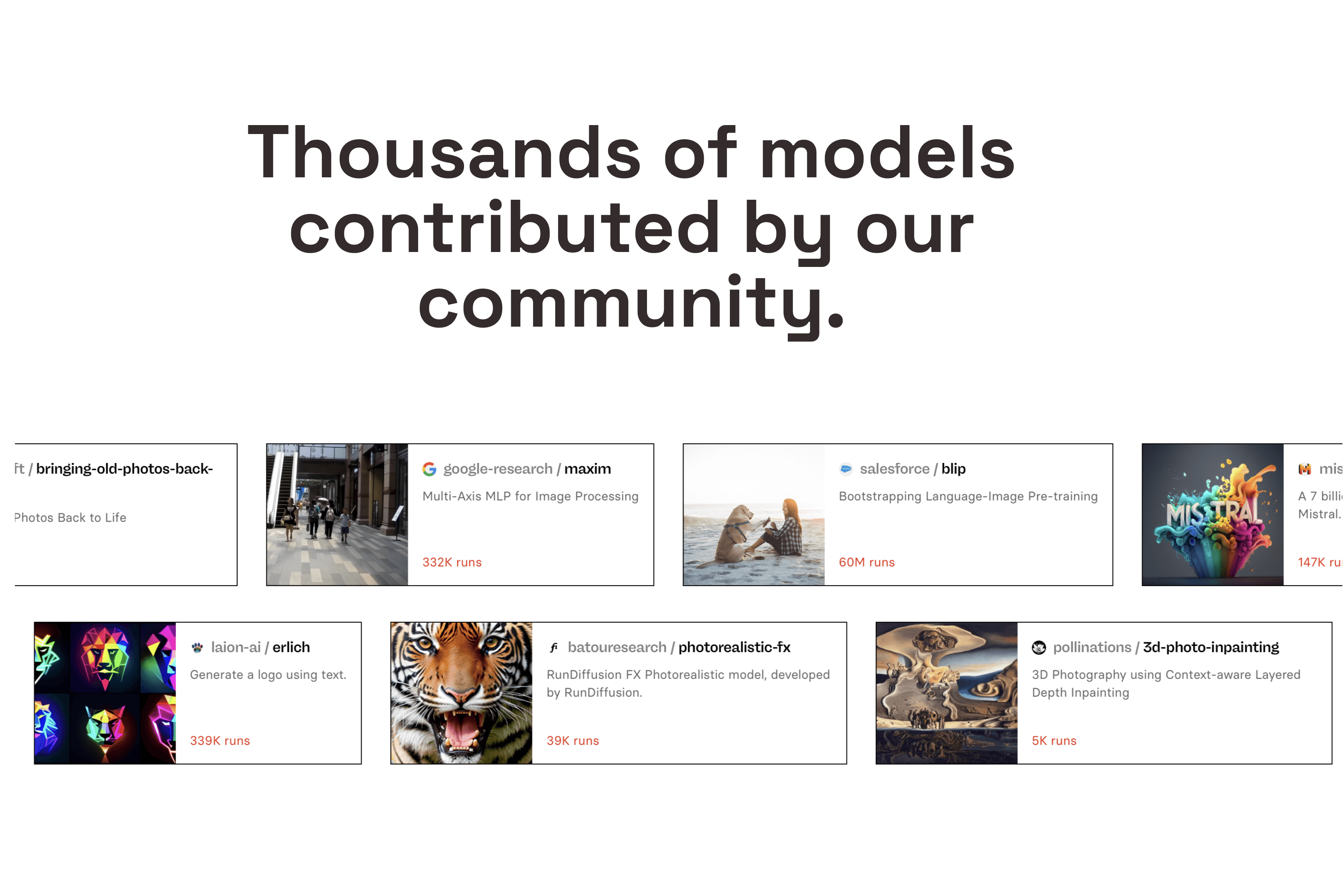 Replicate hosts thousands of open-source models contributed by our community. Generate images, text, videos, music, and speech, upscale your images, and lots more. All with one line of code.
