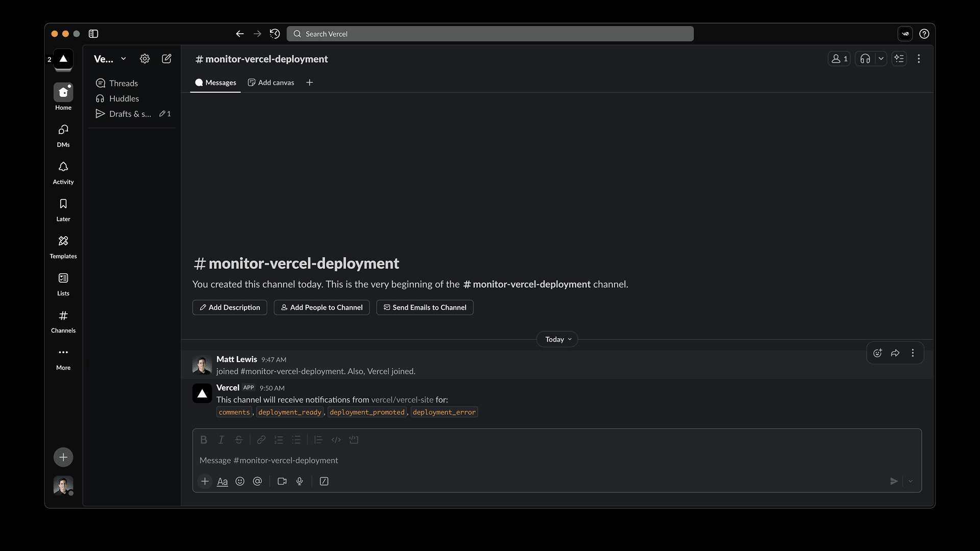 Get Slack messages for comments, deployment status, and new projects on Vercel. This integration allows you to choose Vercel events you’d like to receive Slack messages about and configure these settings for your Slack DMs as well as for specific channels.