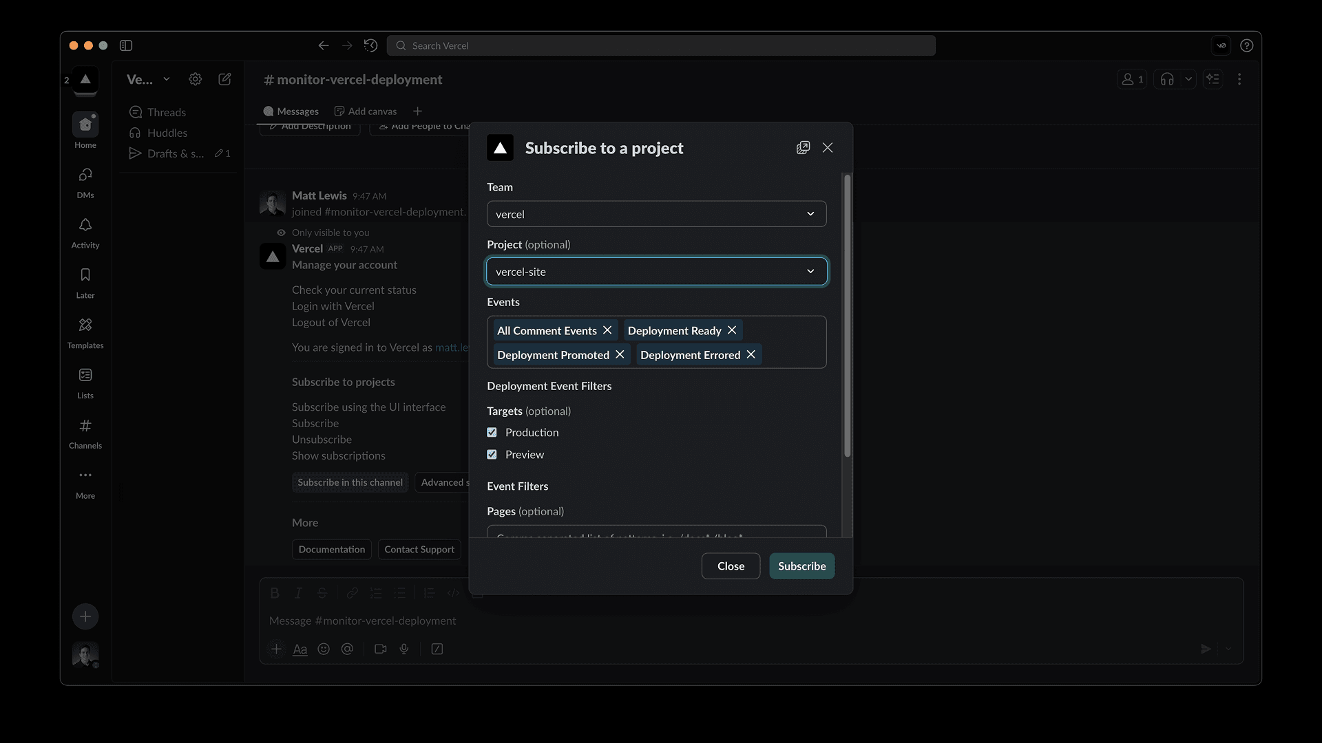 Once the installation is complete, type /vercel subscribe in a channel or your messages to yourself to configure your Vercel Slack events.