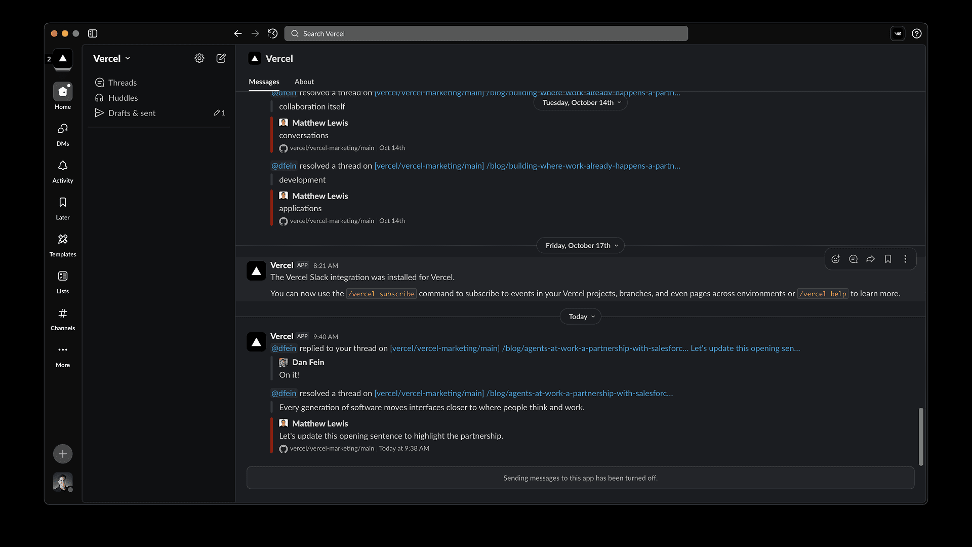 For more information type /vercel help anywhere in Slack or visit the documentation.