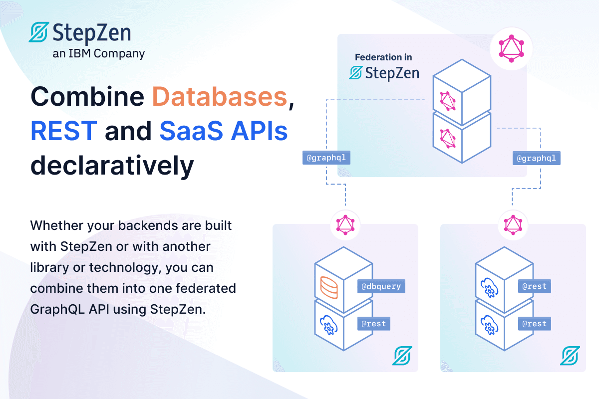 As your project grows, you can also use StepZen to combine different data sources all in one GraphQL API. This way you can combine Databases, SaaS and Third-Party APIs without having to maintain your own servers.