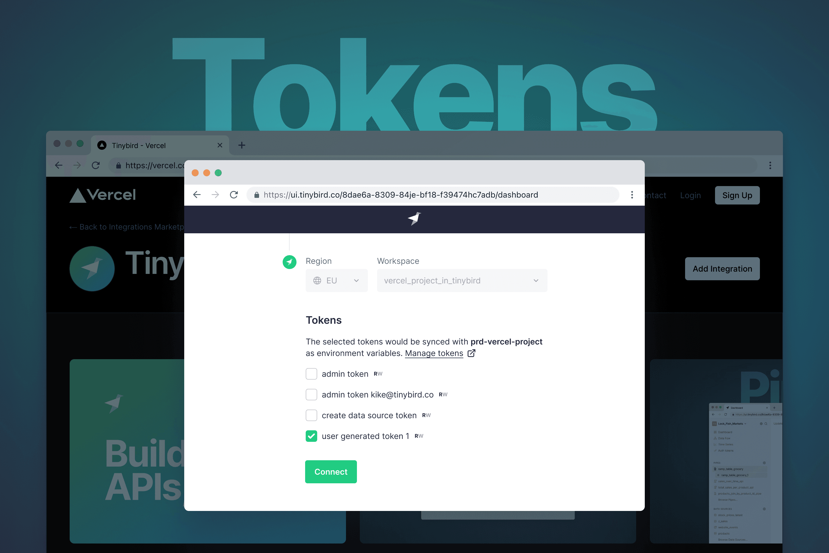 When you set up the integration, you can select which Auth Tokens you want to sync (or create new ones). Head over to your Vercel project’s settings page or your Tinybird Integrations page to see them available as TINYBIRD_WORKSPACE_TOKEN.