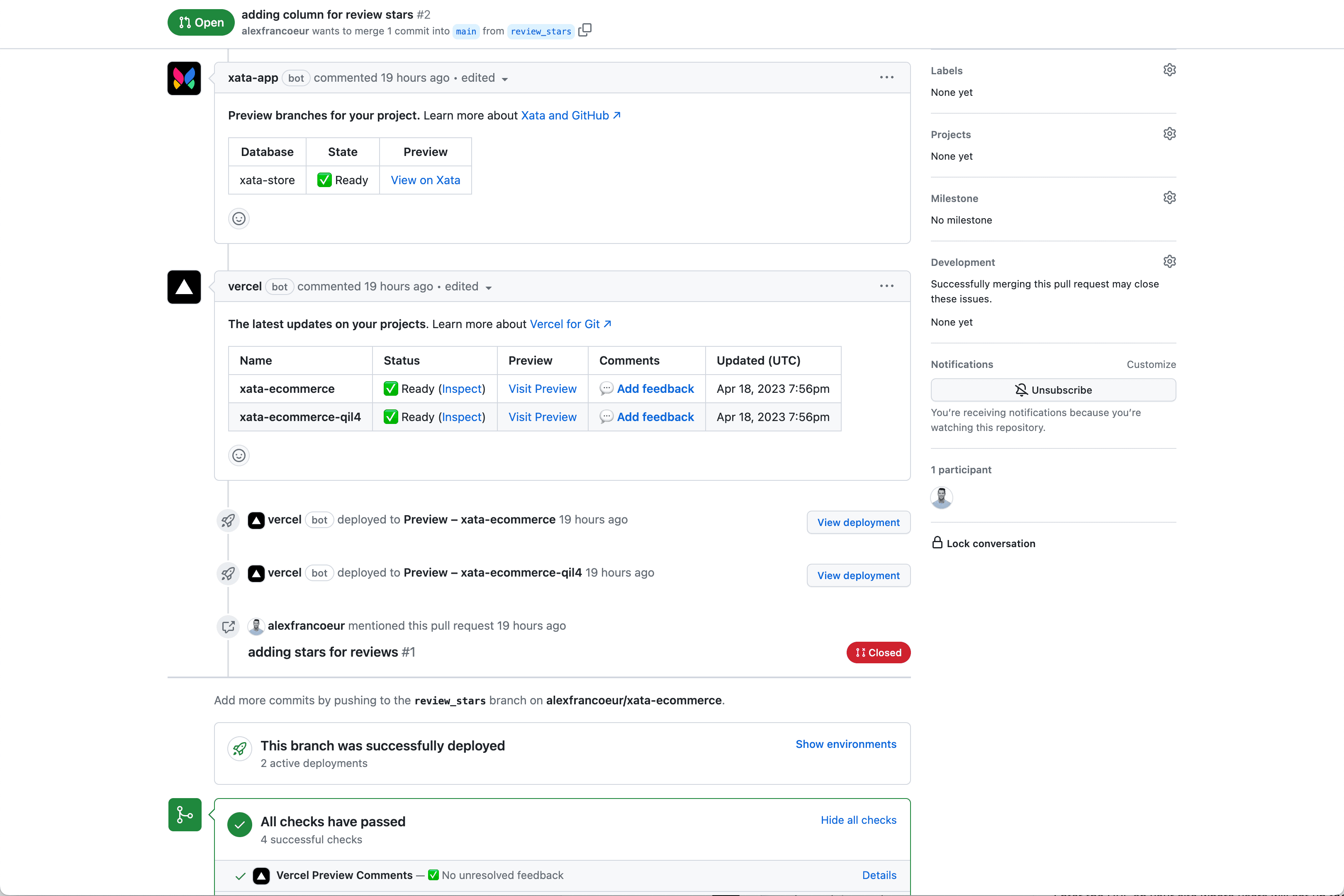 In combination with Xata for GitHub, each pull request creates a data-filled preview branch of your database that automatically integrates with your Vercel deployment previews.